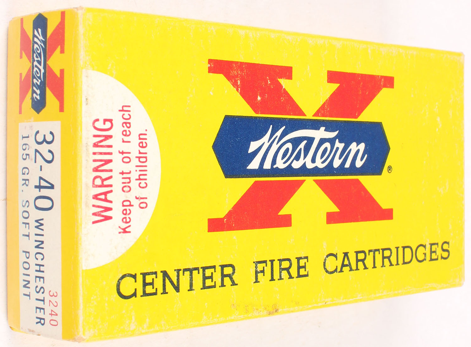 Western, X, .32-40 Winchester, 165 Grain Soft Point, Full, 1pc. Yellow white & red box, box is solid with excellent color, very minor age soiling & corner wear, some shelf wear, edges are mostly crisp, end flaps are solid, ammo is excellent. Grade: Excellent - Value: 30 to 90
