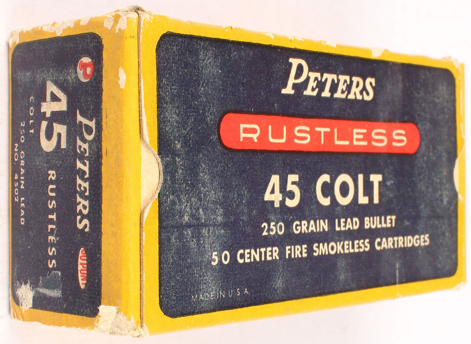 Peters, Rustless, .45 Colt, 250 Grain Lead Bullet, Full, 1pc. Blue yellow & red box, box is solid with very good to excellent color, minor age soiling, some shelf & corner wear, some edge wear, end flaps are solid, ammo is excellent. Grade: Very Good ++ - Value: 20 to 60