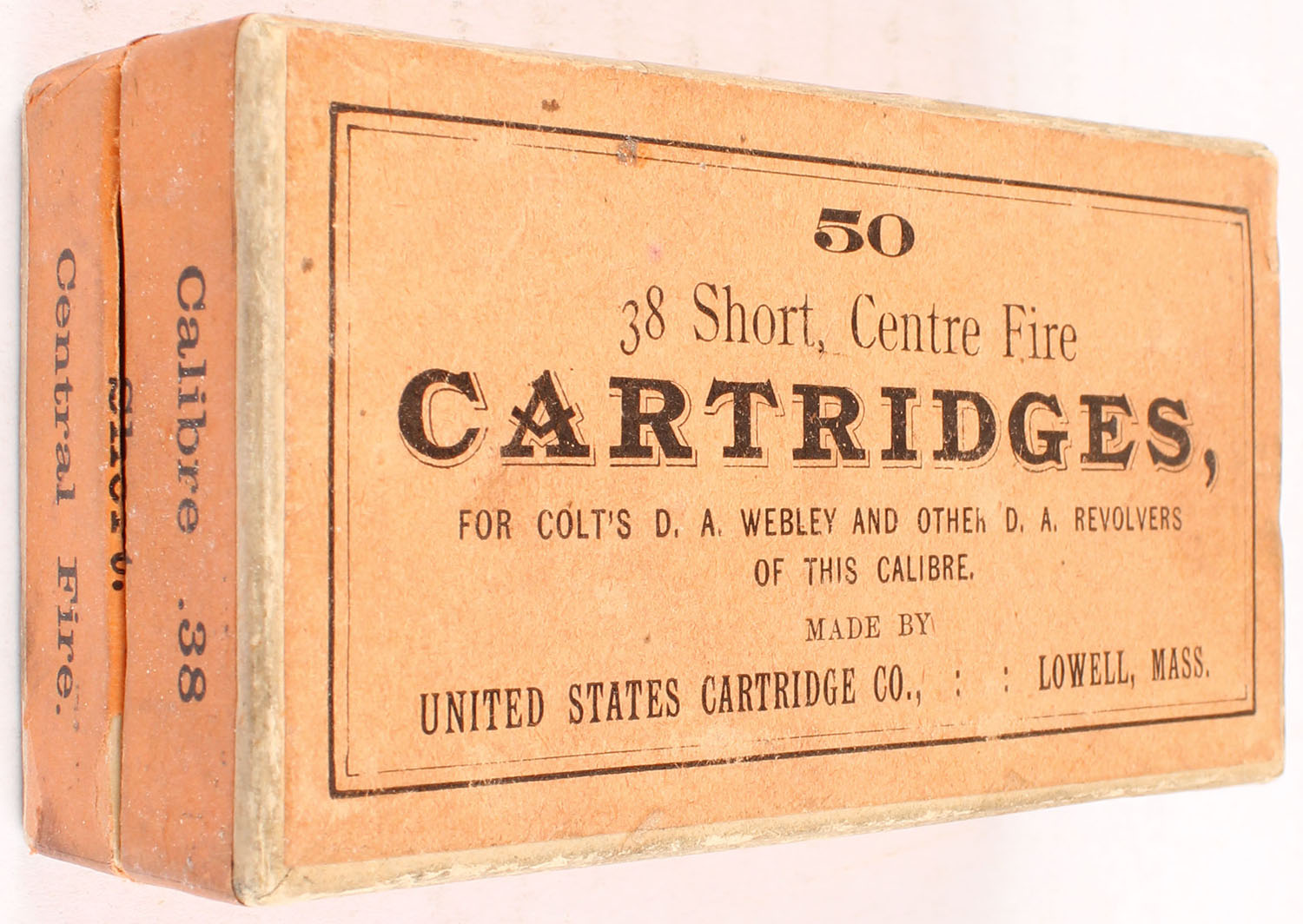 U.S., .38 Short Colt, Central Fire Cartridges, Partial 12rds., 2pc. Buff box with orange top & side sealing labels, box is solid with very good color, some age soiling & color fading, minor edge & corner wear, labels are intact, ammo is good. Grade: Very Good ++ - Value: 8 to 40