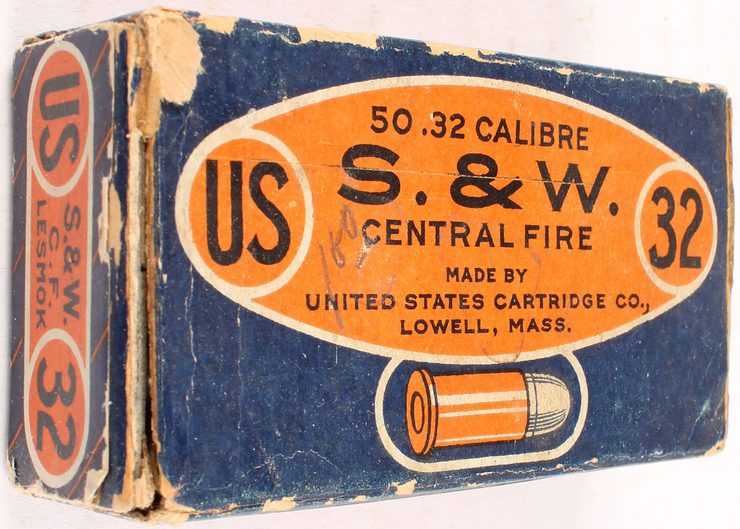 U.S., .32 Smith & Wesson, Central Fire, Lesmok, Full, 1pc. Blue & orange box with blue & orange side sealing label, left end flap is torn, box has very good color, minor age soiling & color fading, top has been written on, some edge & corner wear, right end flap is solid, ammo is very good. Grade: Very Good - Value: 20 to 60
