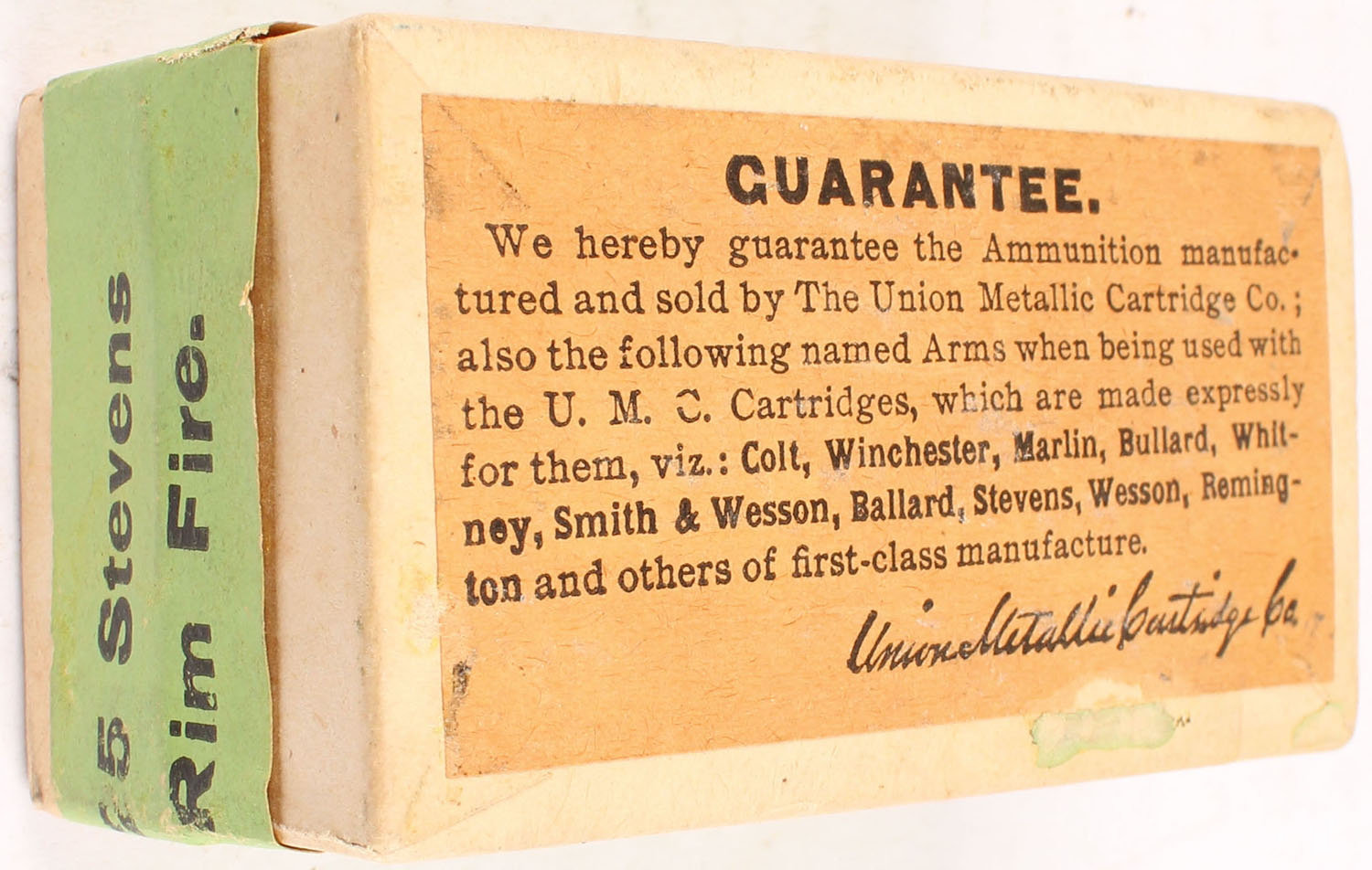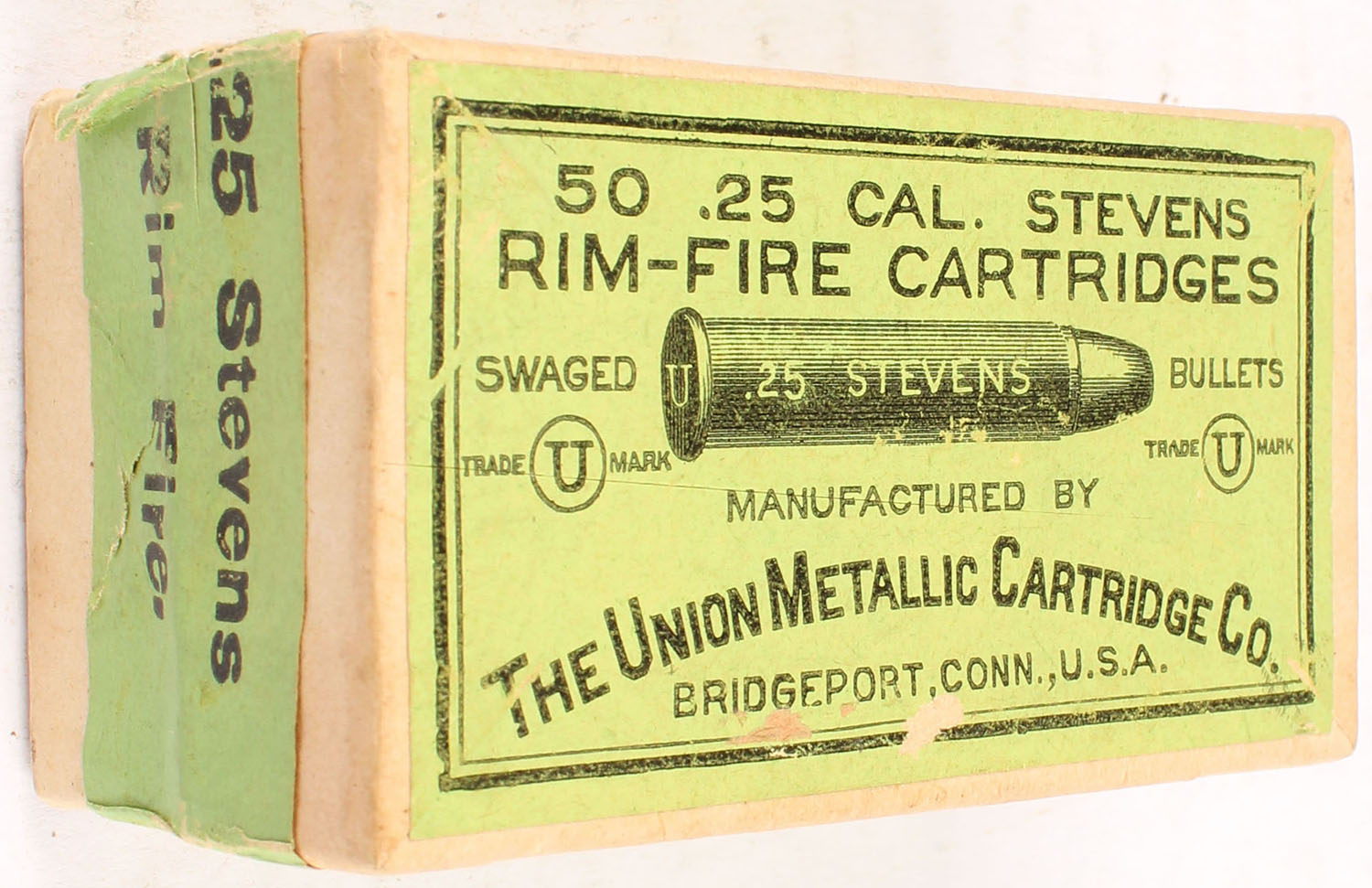 UMC, Rim-Fire Cartridges, .25 Stevens Rim Fire, Swaged Bullets, FULL & SEALED, 2pc. Buff box with green top & side sealing labels, box is solid with excellent color, very minor age soiling & shelf wear, corners are sharp, edges are crisp, labels are intact. Grade: Excellent ++ - Value: 100 to 400