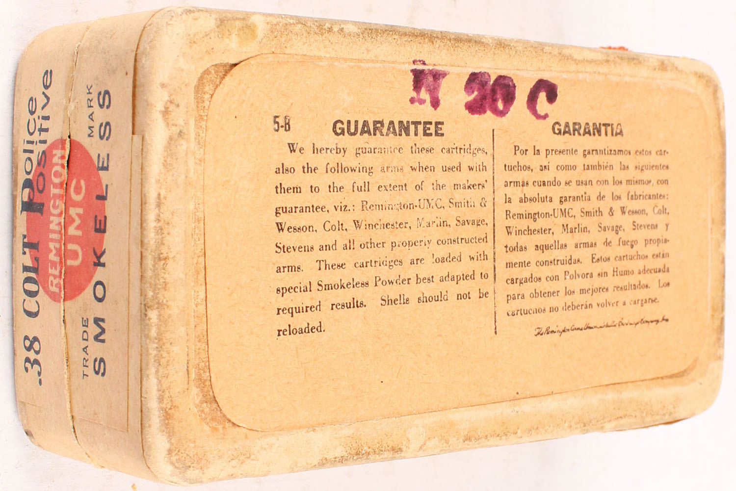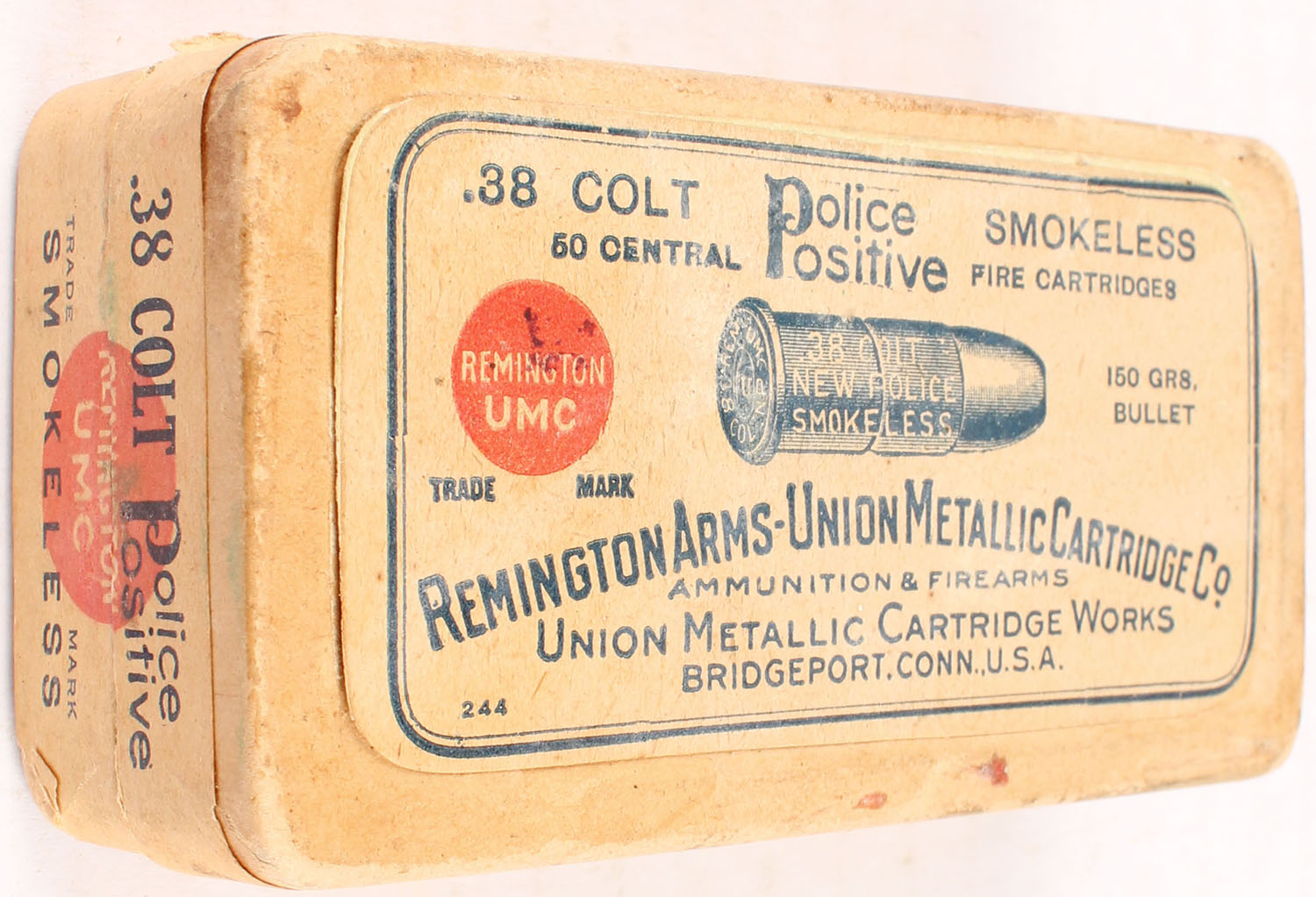 REM-UMC, .38 Colt Police Positive, 150 Grain Bullet, Smokeless, Full, 2pc. Buff box with buff top & side sealing labels, box is solid with very good to excellent color, minor age soiling & shelf wear, minor edge & corner wear, labels are intact, ammo is good to very good. Grade: Excellent - Value: 40 to 120