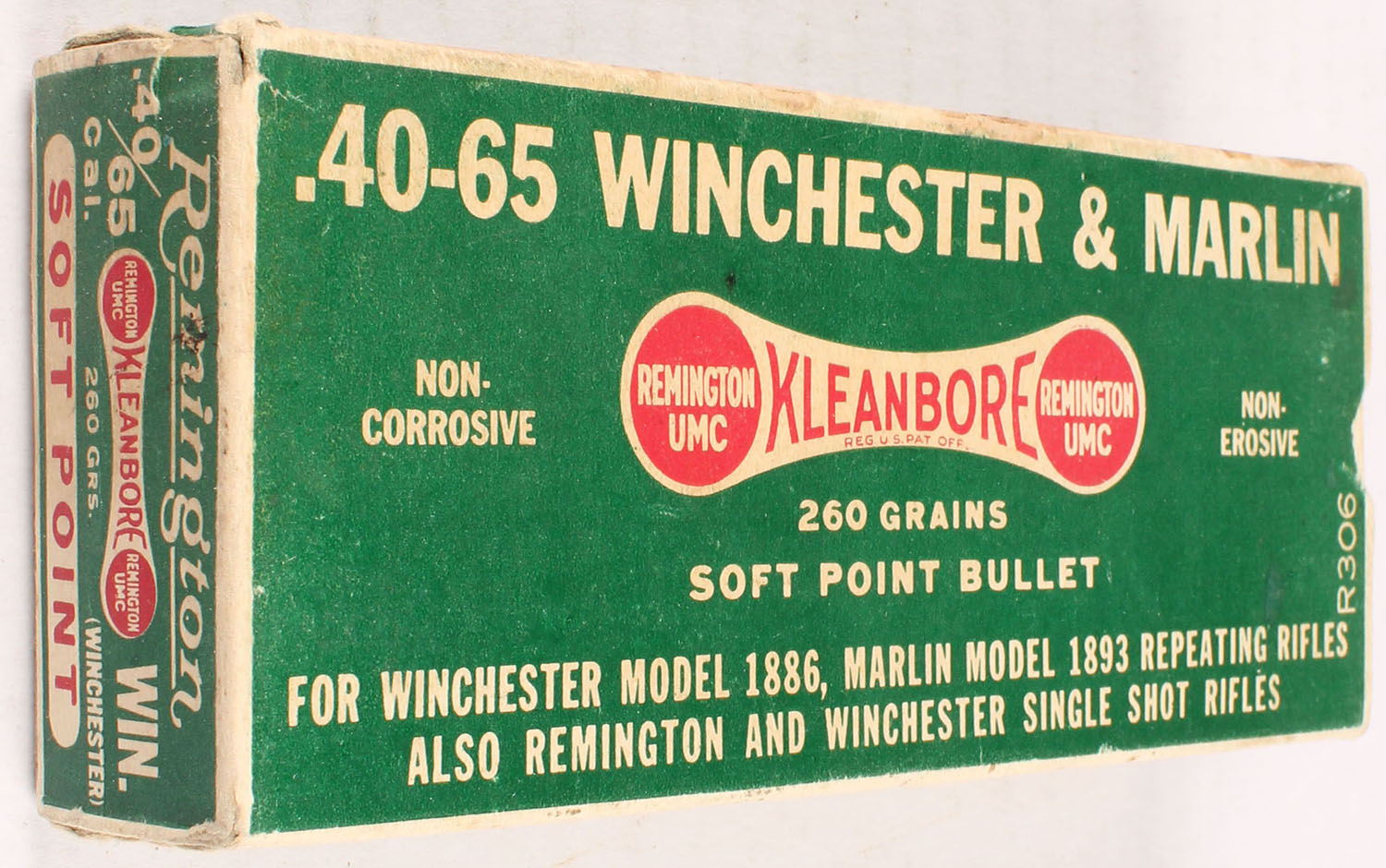 Remington, Kleanbore, .40-65 Winchester, 260 Grain Soft Point Bullet, Full, 1pc. Green buff & red dogbone box, box is solid with excellent color, minor age soiling, some edge & corner wear, end flaps are solid, ammo is excellent. Grade: Excellent + - Value: 50 to 200