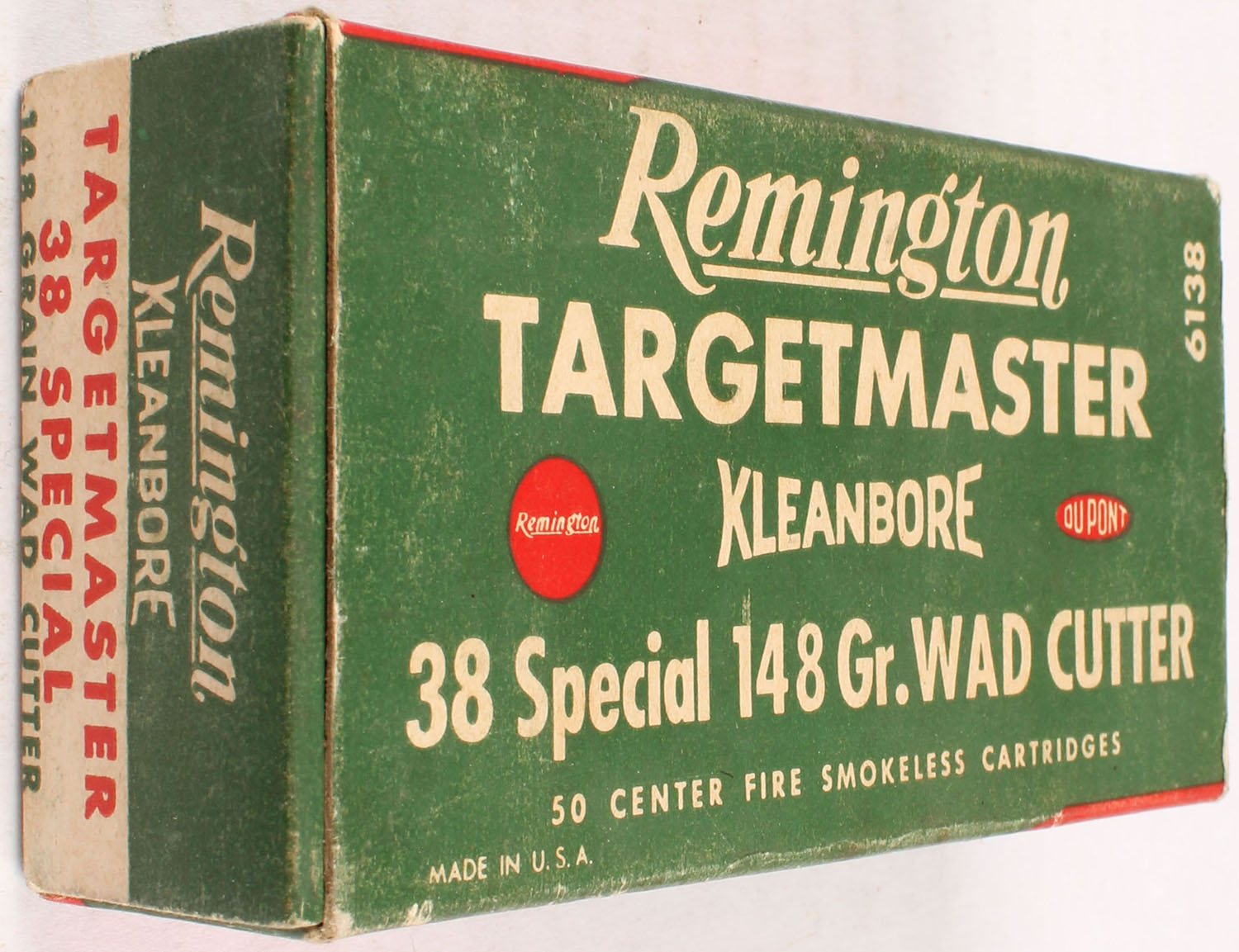 Remington, Kleanbore Targetmaster, .38 Special, 148 Grain Wad Cutter, Full of mixed H/S, 1pc. Green white & red box, box is solid with excellent color, minor age soiling & shelf wear, minor corner wear, very minor edge wear, end flaps are solid, ammo is excellent. Grade: Excellent - Value: 10 to 40