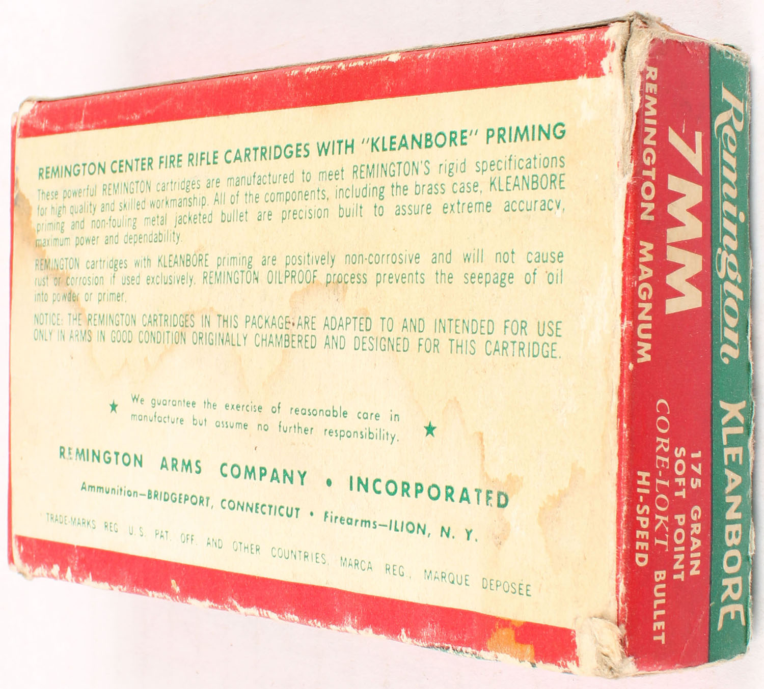 Remington, Kleanbore Hi-Speed, 7mm Remington Magnum, 175 Grain Soft Point Core-Lokt Bullet, Full, 1pc. Green white & red box, box is solid with excellent color, shelf wear, some edge & corner wear, end flaps are solid, ammo is excellent. Grade: Very Good + - Value: 20 to 60