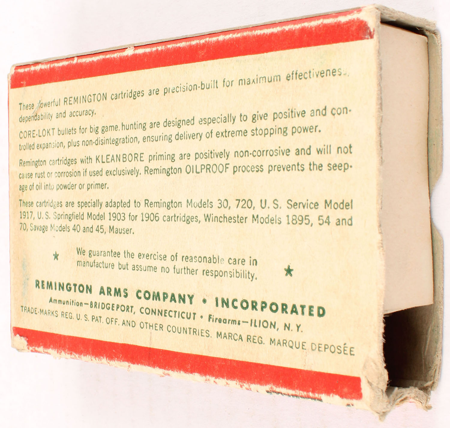 Remington, Kleanbore Hi-Speed, .30-06 Springfield, 180 Grain Soft Point Core-Lokt Bullet, Partial 18rds. Of incorrect ammo, 1pc. Green white & red box, missing right end flap, very good color, some age soiling & shelf wear, some edge & corner wear, left end flap is solid, ammo is excellent. Grade: Very Good - Value: 8 to 40