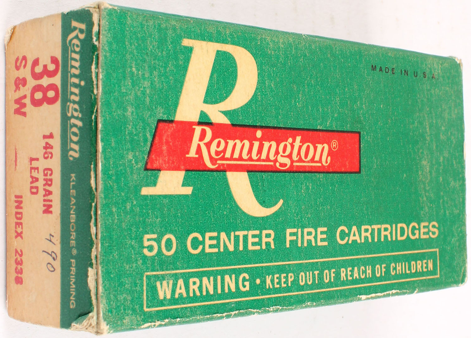 Remington, .38 Smith & Wesson, 146 Grain Lead, Full, 1pc. Green white & red box, box is solid with very good color, some age soiling, minor shelf wear, some corner & edge wear, end flaps are solid, right end has been written on, ammo is excellent. Grade: Very Good ++ - Value: 20 to 60