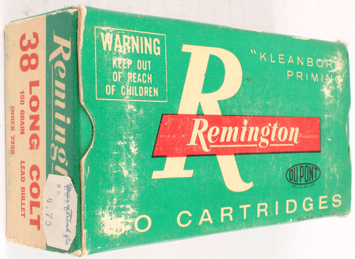 Remington, .38 Long Colt, 150 Grain Lead Bullet, Full, 1pc. Green white & red box, box is solid with very good to excellent color, minor age soiling, some shelf wear, minor edge & corner wear, end flaps are solid, ammo is excellent. Grade: Very Good ++ - Value: 30 to 90