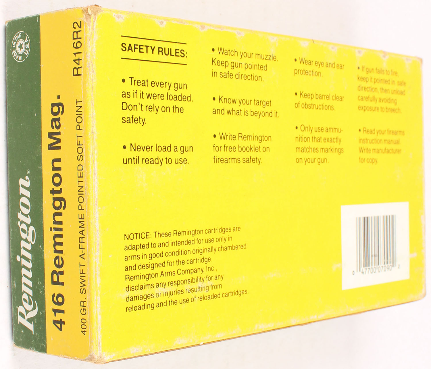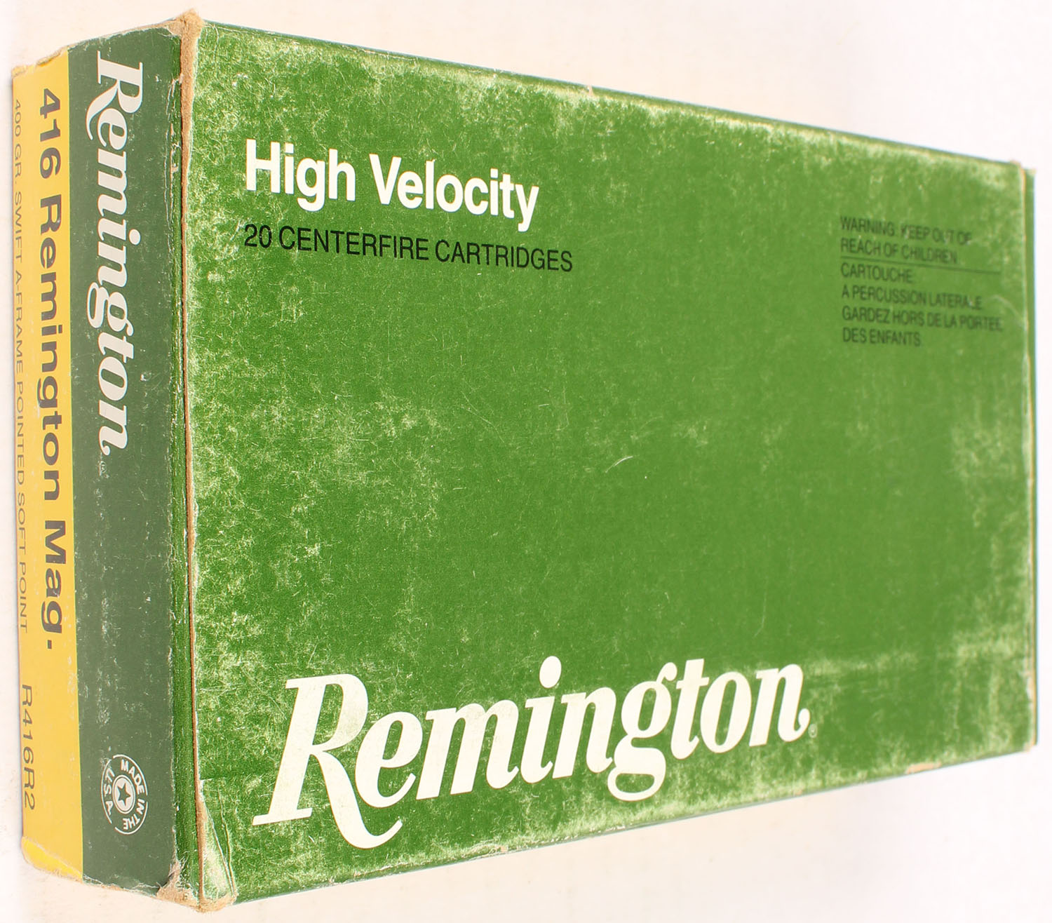 Remington, High Velocity, .416 Remington Magnum, 400 Grain Swift A-Frame Pointed Soft Point, Full, 1pc. Green yellow & white box, box is solid with excellent color, some shelf wear, minor corner wear, very minor edge wear, end flaps are solid, ammo is excellent. Grade: Excellent - Value: 20 to 60