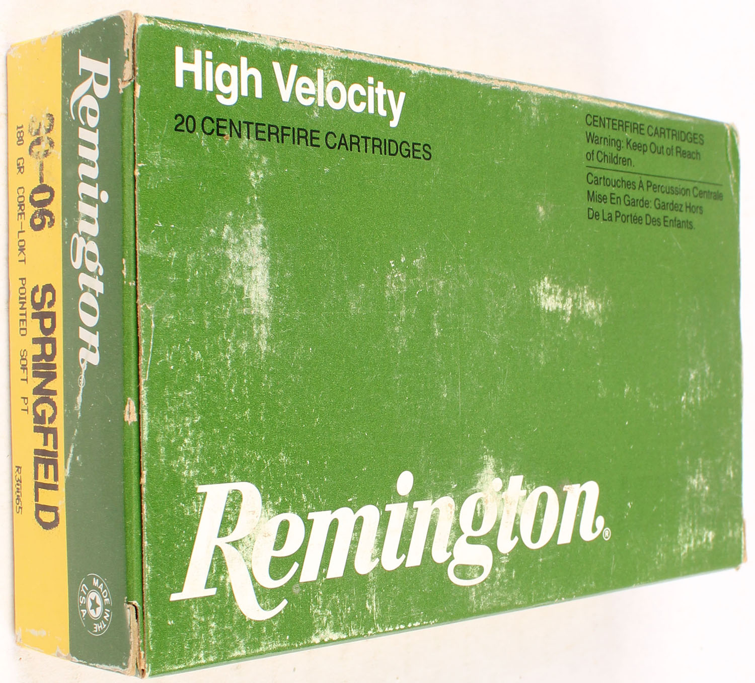Remington, High Velocity, .30-06 Springfield, 180 Grain Core-Lokt Pointed Soft Point, Partial 18rds. correct, 1pc. Green yellow & white box, box is solid with excellent color, some shelf wear, very minor edge & corner wear, end flaps are solid, ammo is excellent. Grade: Excellent - Value: 10 to 40