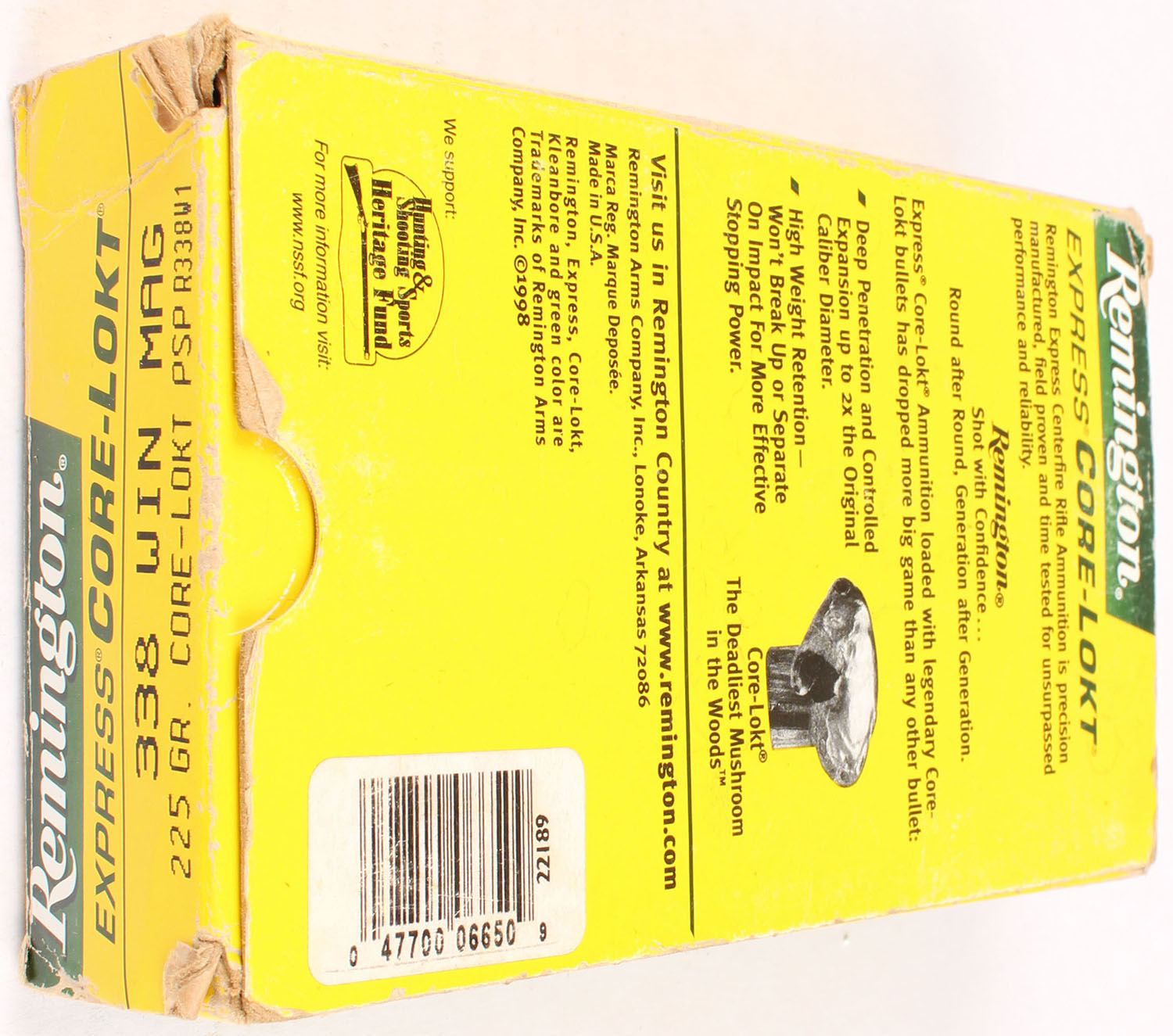 Remington, Express Core-Lokt, 338 Win Mag, 225 Grain PSP, Full, 1pc. Yellow, green, white & black box, box is solid with good color, end flaps are solid, edge & corner wear, light shelf wear, ammo is excellent. Grade: Very Good ++ - Value: 10 to 50