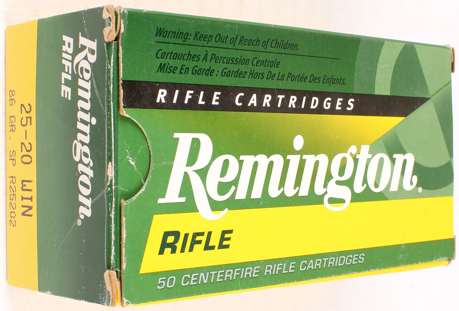 Remington, Rifle, 25-20 Win, 86 Grain SP, Full, 1pc. Yellow, green, white & black box, box is solid with great color, end flaps are solid, ammo is excellent. Grade: Excellent - Value: 20 to 80