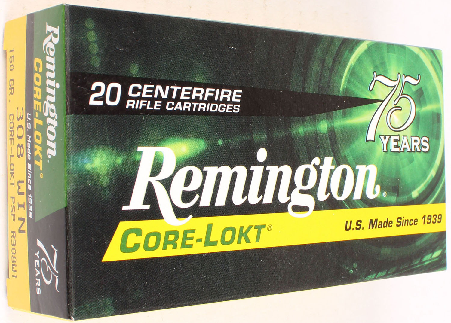 Remington, 75 Years, 308 Win, 150 Grain Core-Lokt PSP, Full, 1pc. Yellow, green, white & black box, box is very solid with great color, end flaps are solid, ammo is excellent. Grade: Excellent ++ - Value: 20 to 80
