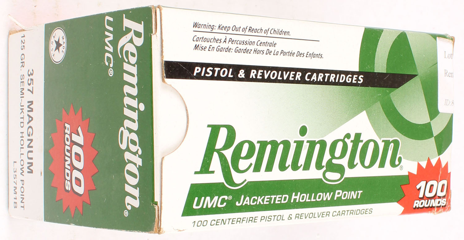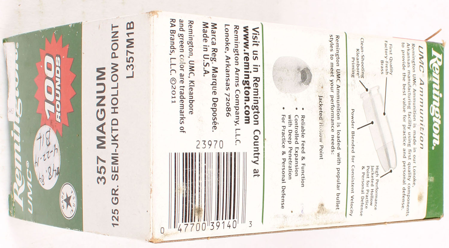 Remington, Target, 357 Magnum, 125 Grain Semi-JKTD Hollow Point, Full, 1pc. Red, green, white & black box, box is solid with great color, light corner wear, end flaps are solid, ammo is excellent. Grade: Excellent + - Value: 20 to 80