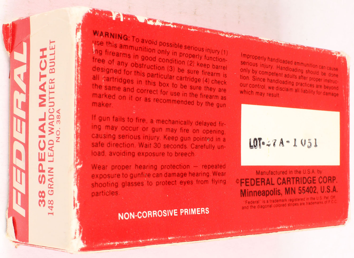 Federal, 38 Special Match, 148 Grain Lead Wadcutter Bullet, Full, 1pc., red, white & black box, box is solid with very good color, light corner & edge wear, end flaps are solid, ammo is excellent. Grade: Very Good ++ - Value: 20 to 80
