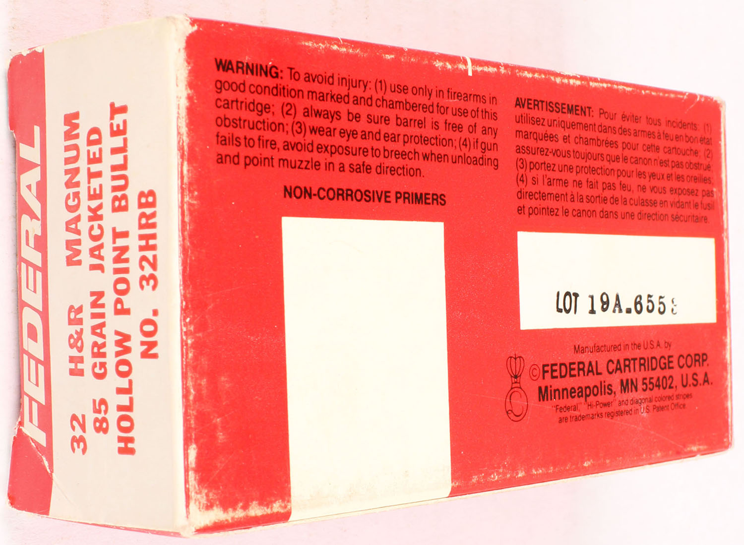 Federal, Hi-Power, 32 H&R Magnum, 85 Grain Jacketed Hollow Point Bullet, Full, 1pc., red, white & black box, box is solid with very good color, corner & edge wear, light shelf wear, end flaps are solid, ammo is excellent. Grade: Very Good ++ - Value: 20 to 80