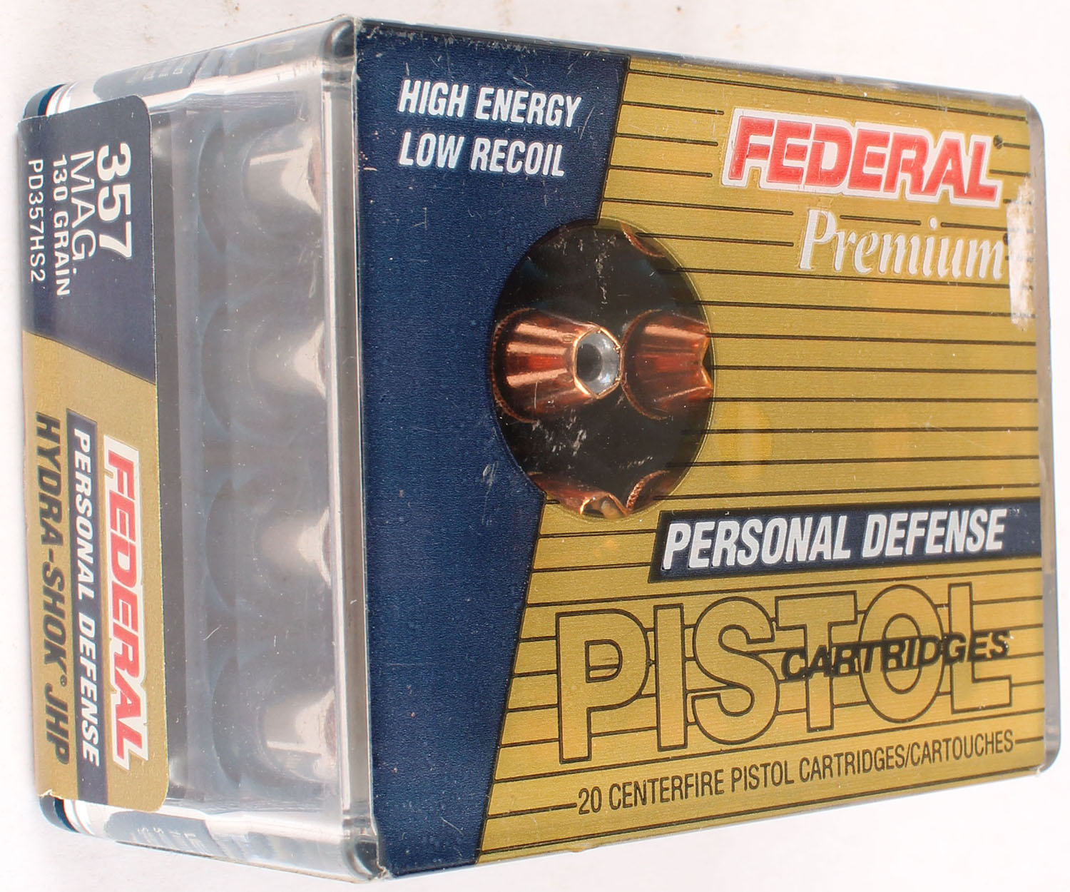 Federal, Personal Defense, 357 Mag, 130 Grain Hydra Shok JHP, FULL & SEALED, 1pc., multi-colored box, box is solid, light shelf wear & very good color, ammo is excellent. Grade: Very Good ++ - Value: 10 to 40