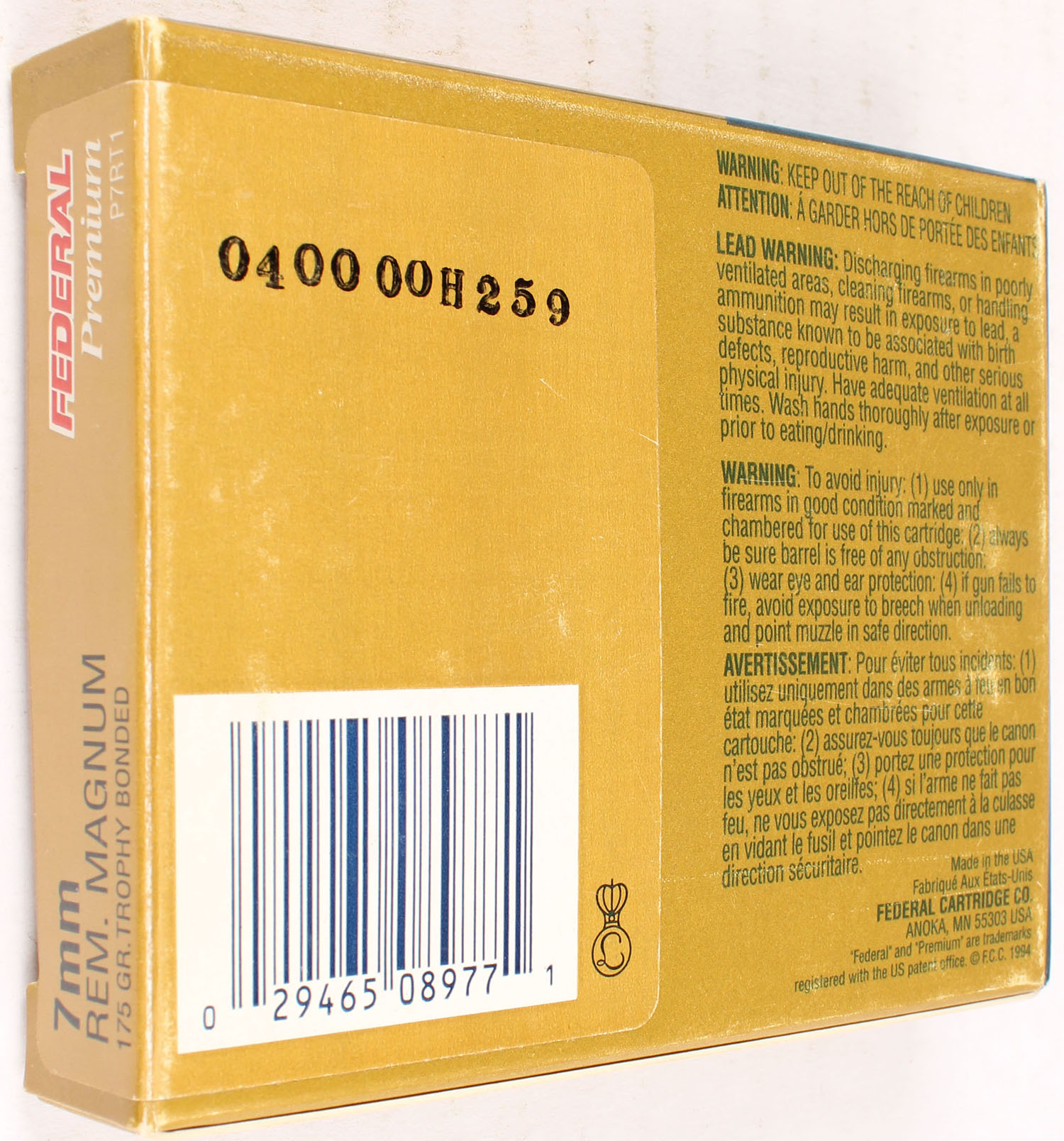 Federal, 7mm Rem Magnum, 175 Grain Trophy Bonded, Full, 1pc., multi-colored box, box is solid with very good color, minor shelf wear, end flaps are solid, ammo is excellent. Grade: Excellent + - Value: 10 to 40