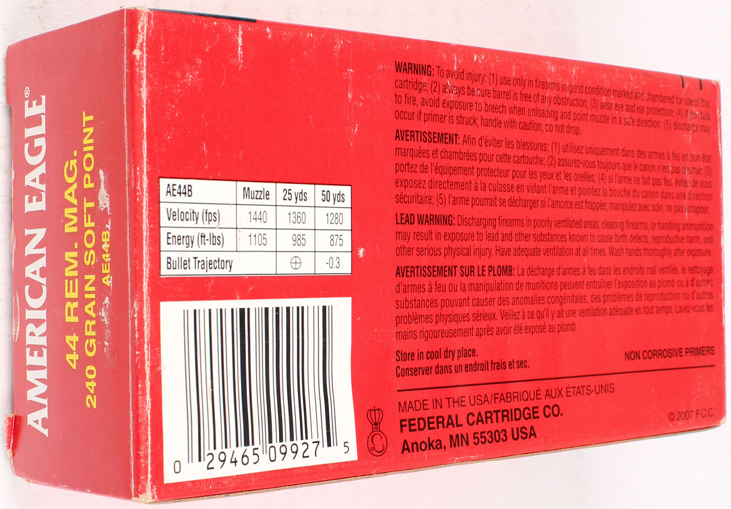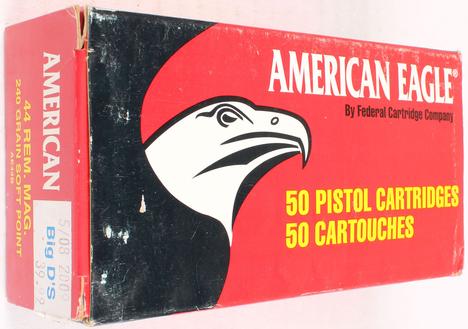 American Eagle, 44 Rem Mag, 240 Grain Soft Point, Full, 1pc., multi-colored box, box is solid with great color, light shelf wear, light edge & corner wear, end flaps are solid, ammo is excellent. Grade: Very Good ++ - Value: 10 to 50