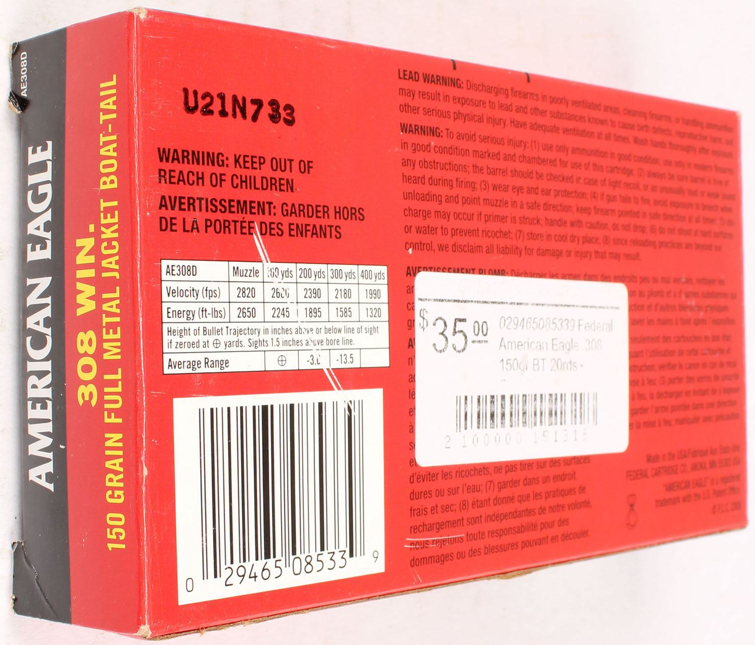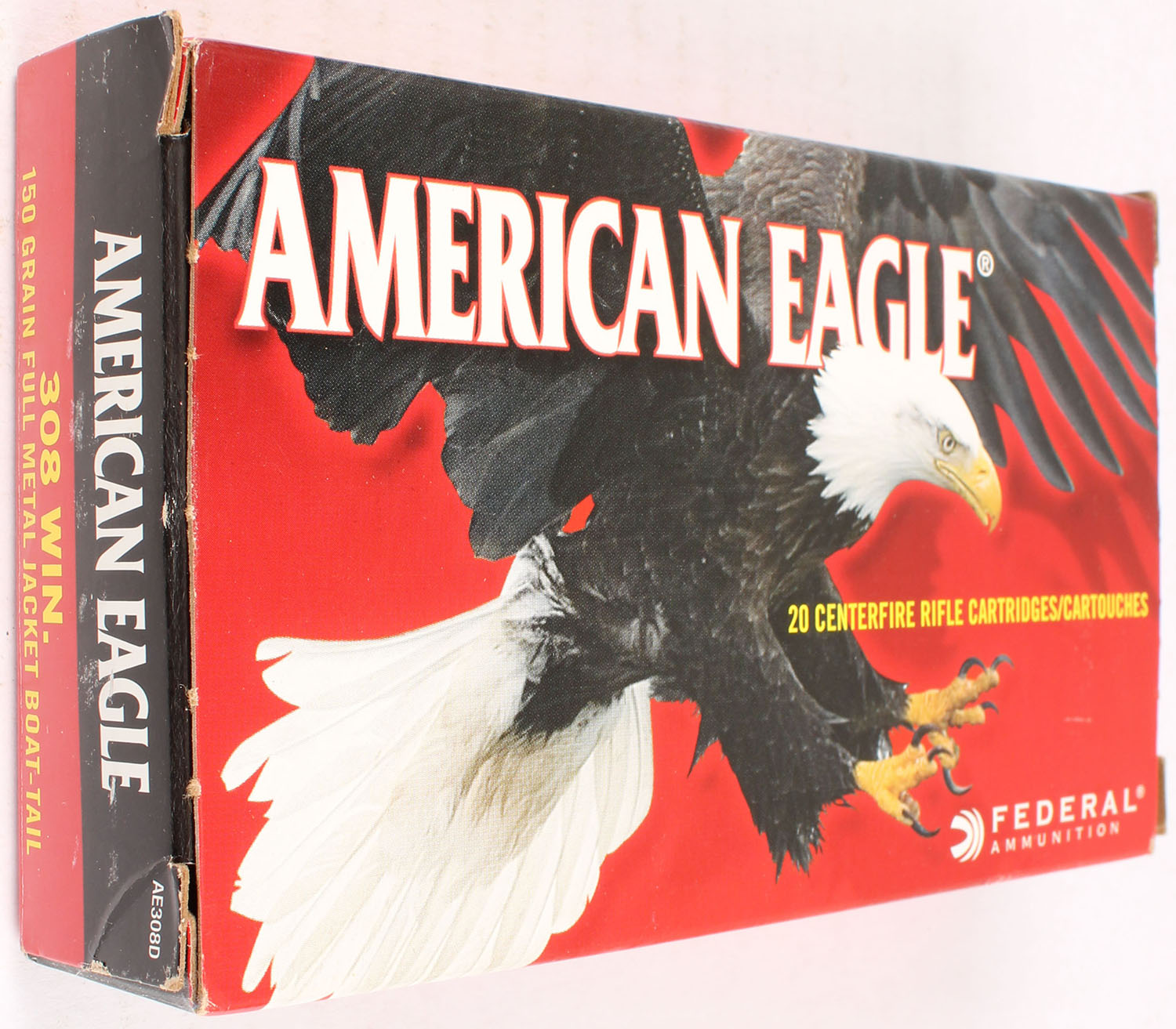 American Eagle, 308 Win, 150 Grain FMJ Boat Tail, Full, 1pc., multi-colored box, box is solid with great color, light shelf wear, light corner wear, end flaps are solid, ammo is excellent. Grade: Excellent - Value: 10 to 50