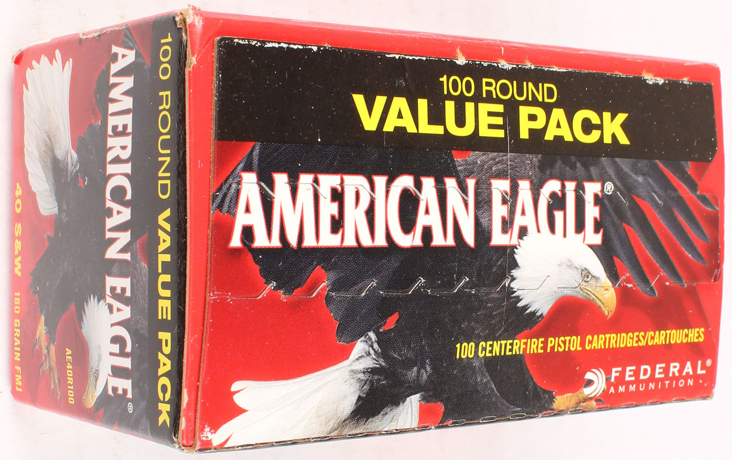 American Eagle, 40 S&W, 180 Grain FMJ, FULL & SEALED, 1pc., multi-colored box, box is solid with great color, light edge & corner wear, end flaps are solid. Grade: Excellent - Value: 10 to 50
