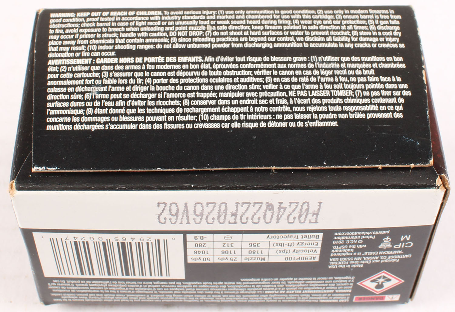Federal, American Eagle, 9mm Luger, 115 Grain FMJ, FULL & SEALED, 1pc., multi-colored box, box is solid with great color, light edge & corner wear, end flaps are solid, ammo is excellent. Grade: Excellent + - Value: 10 to 50