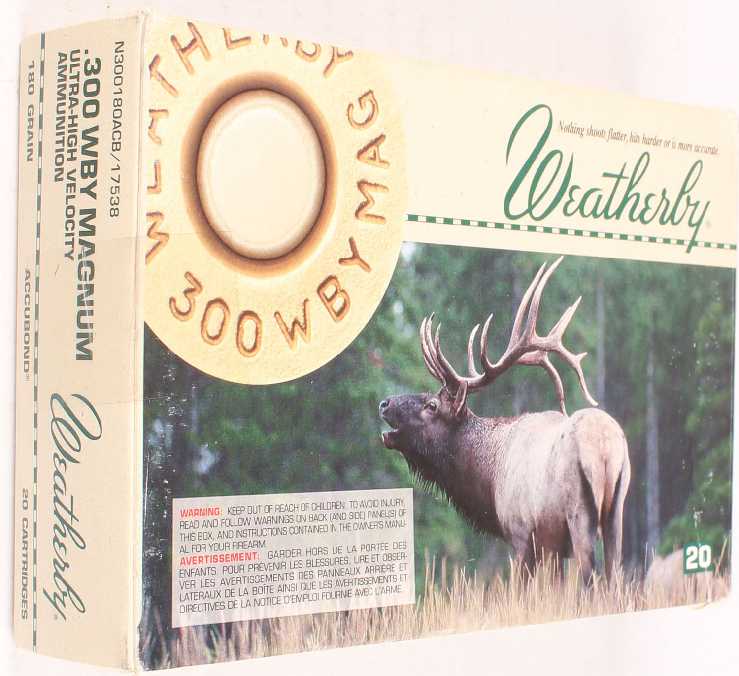 Weatherby, 300 WBY Magnum, 180 Grain Ultra High Velocity Accubond, Full with 3rds being fired empties & 2rds having broken polymer tips, 1pc., multi-colored box, box has very good color, light corner & edge wear, small tears, ammo is very good. Grade: Very Good ++ - Value: 20 to 80