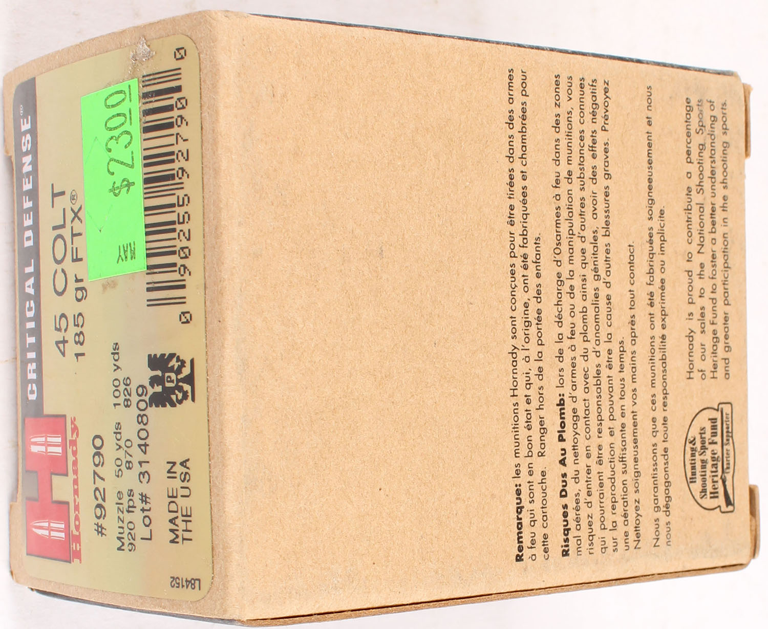 Hornady, Critical Defense, .45 Colt, 185 Grain FTX, Full, 1pc. multi-colored box, box is solid with excellent color, Ammo is excellent. Grade: Excellent ++ - Value: 20 to 60
