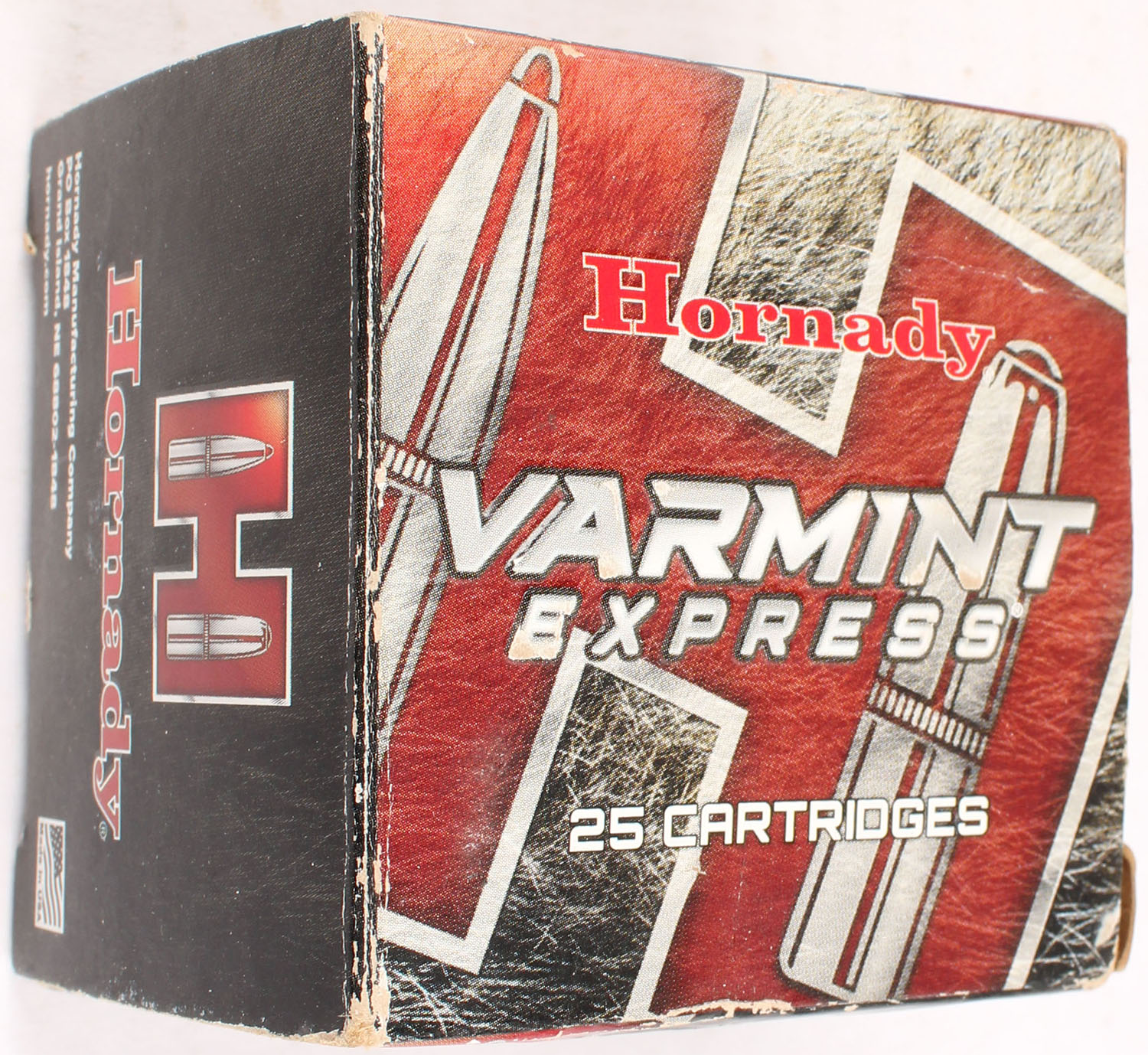 Hornady, Varmint Express, .22 Hornet, 35 Grain V-Max, Full, 1pc. multi-colored box, box is solid with excellent color, Ammo is excellent. Grade: Excellent ++ - Value: 20 to 60