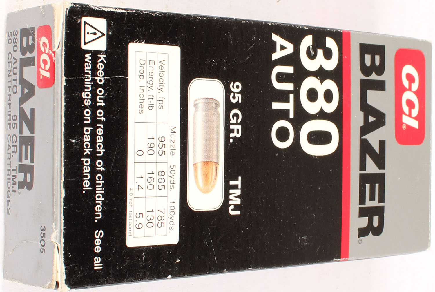CCI, Blazer, 380 Auto, 95 Grain TMJ, Full, 1pc. multi-colored box, box is solid with excellent color, Ammo is excellent. Grade: Excellent ++ - Value: 16 to 50