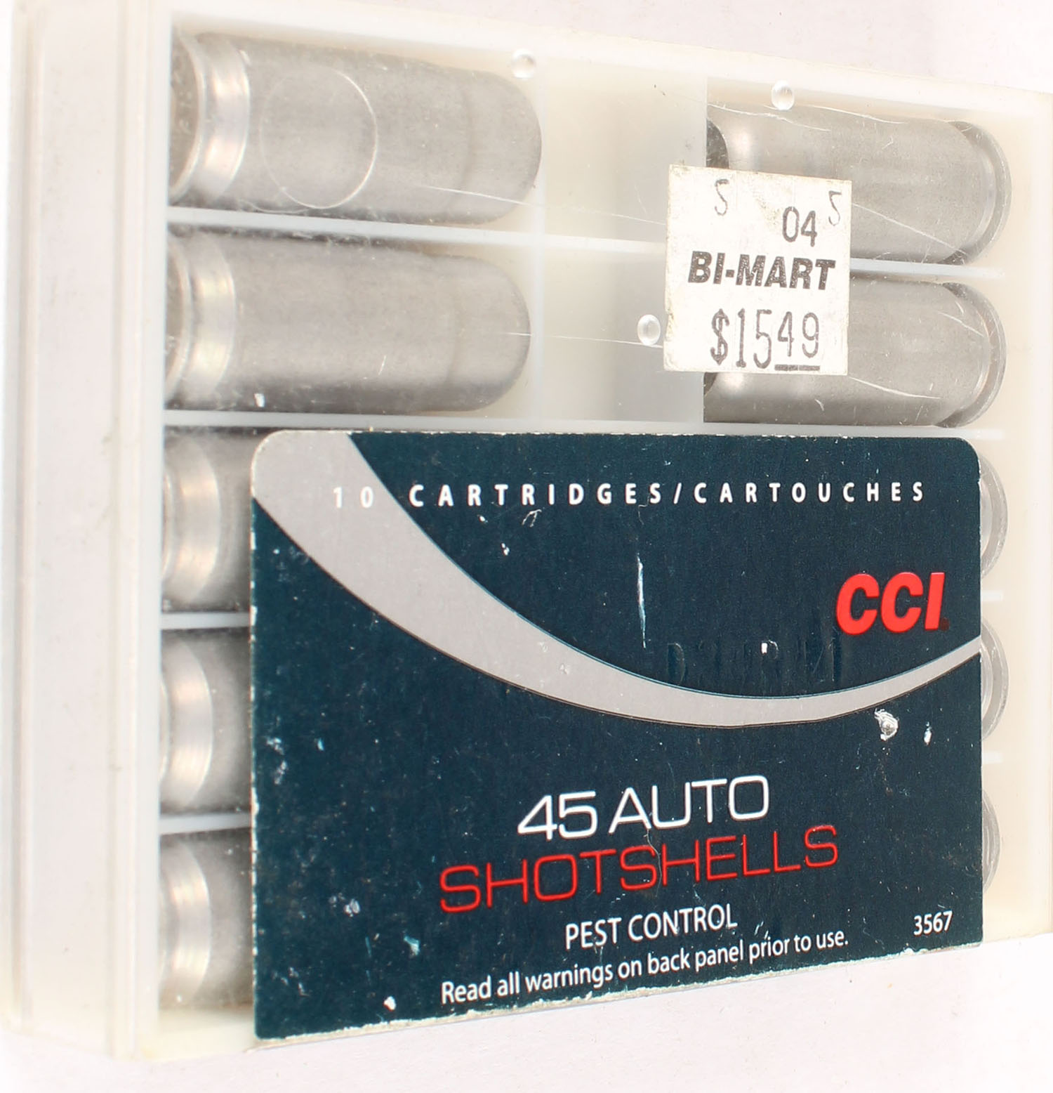 CCI, .45 auto Shotshells, 210 pellets, Full, 1pc. multi-colored box, box is solid with excellent color, Ammo is excellent. Grade: Excellent ++ - Value: 16 to 50