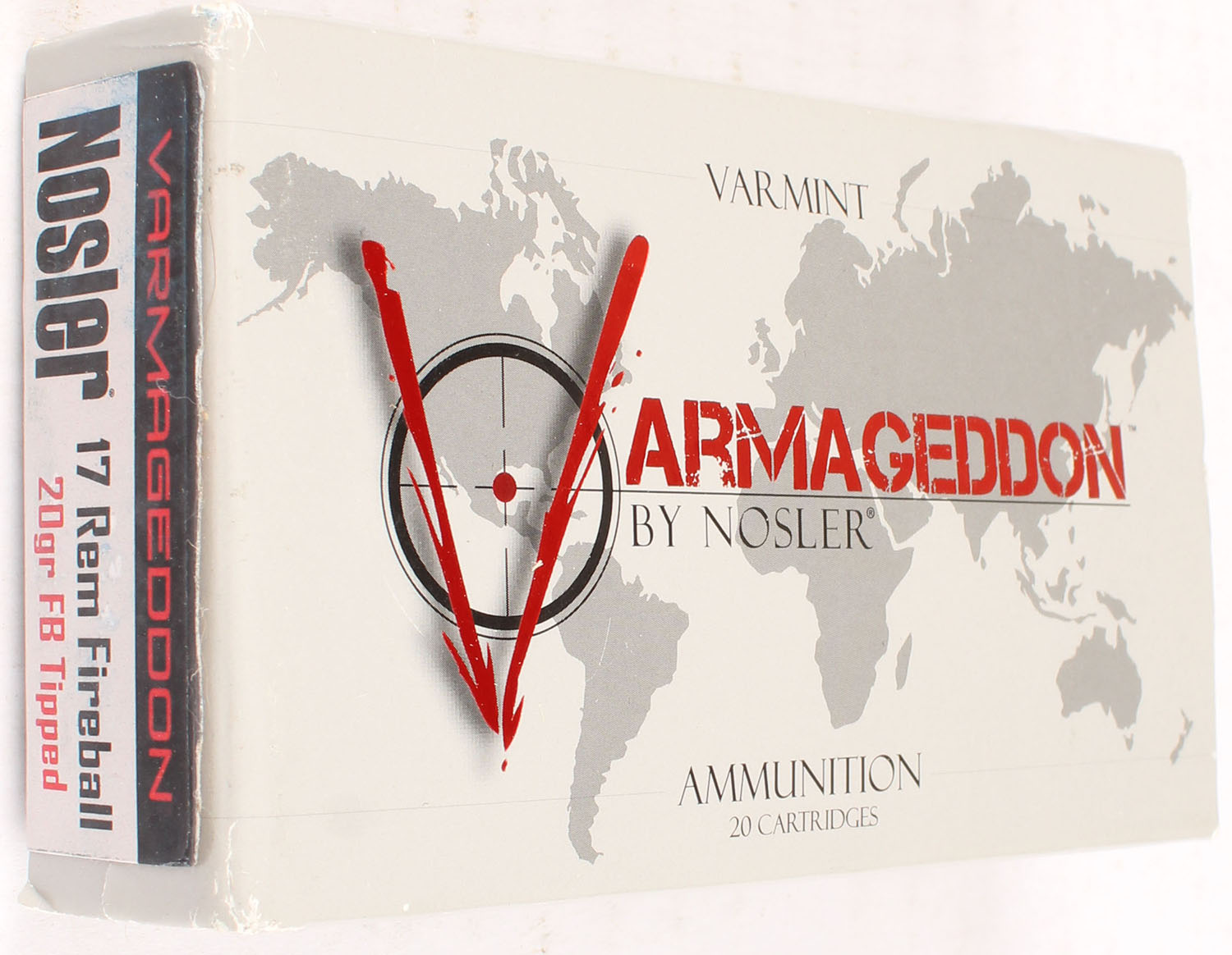 Nosler Armageddon, .17 Rem Fireball, 20 Grain FB tipped, Full, 1pc. multi-colored box, box is solid, Ammo is excellent. Grade: Excellent ++ - Value: 16 to 50
