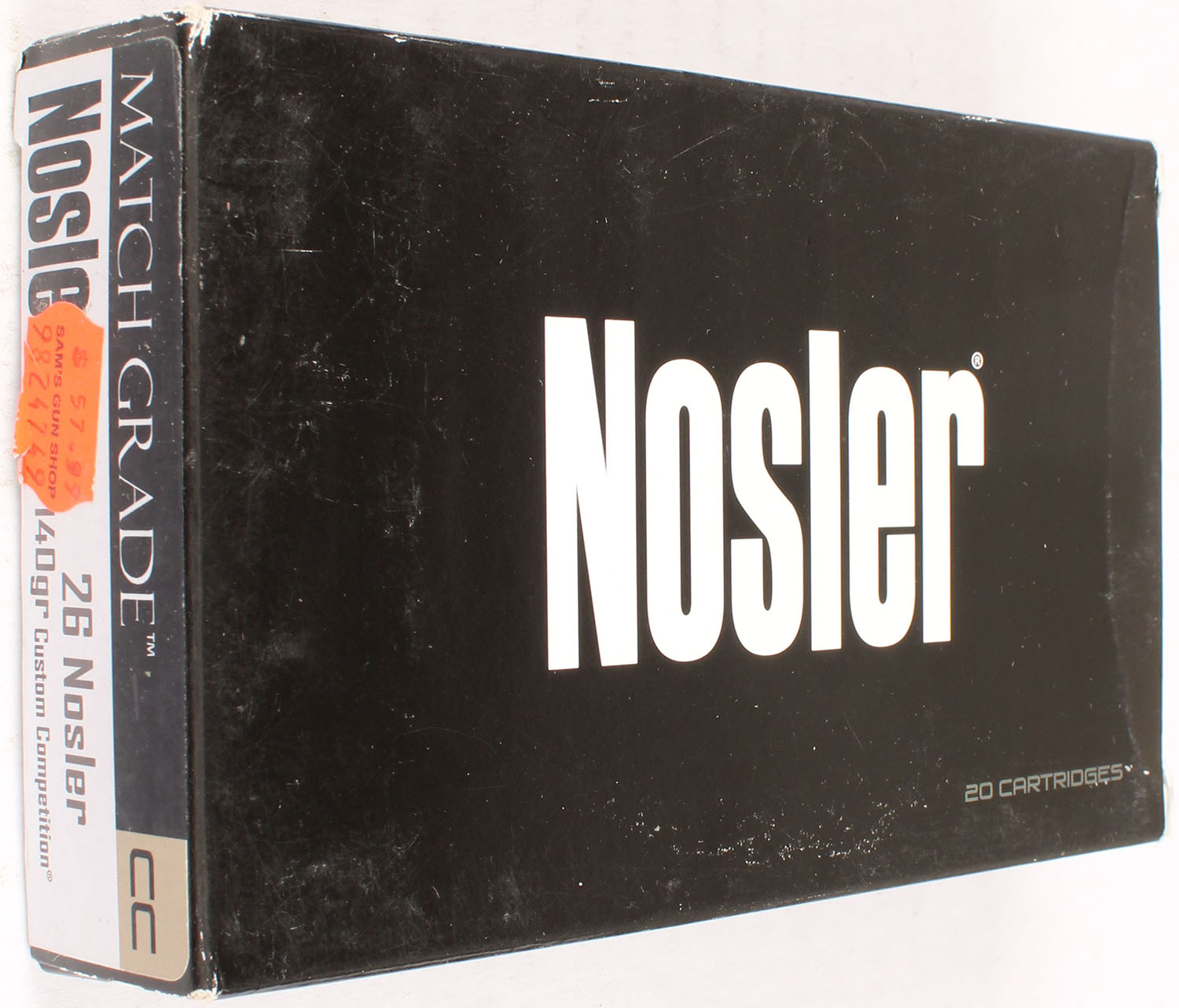 Nosler, MATCH Grade, 26 Nosler, 140 Grain, Full, 1pc. multi-colored box, box is solid with excellent color, Ammo is excellent. Grade: Excellent ++ - Value: 20 to 80