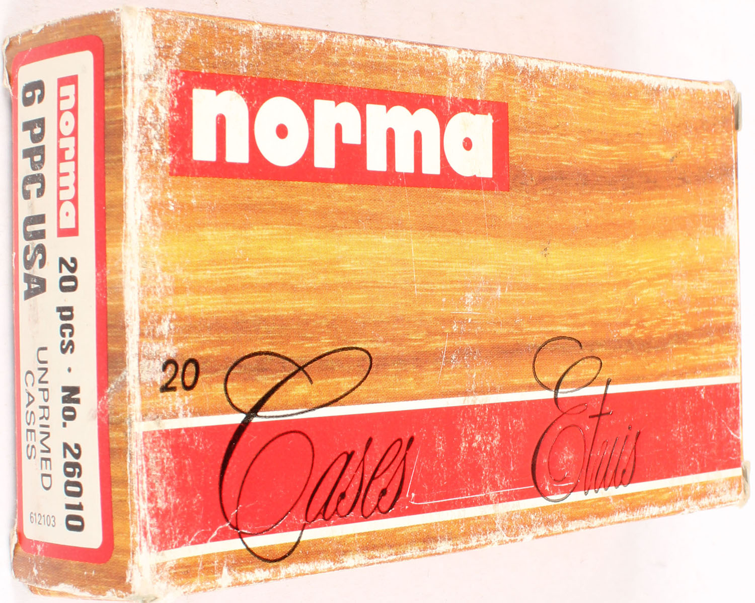 Norma, 6 PPC USA, boxed marked unprimed cases but ammo is primed and loaded, 20 rds., 1pc. multi-colored box, box has scuffing, Ammo is excellent. Grade: Very Good ++ - Value: 6 to 50