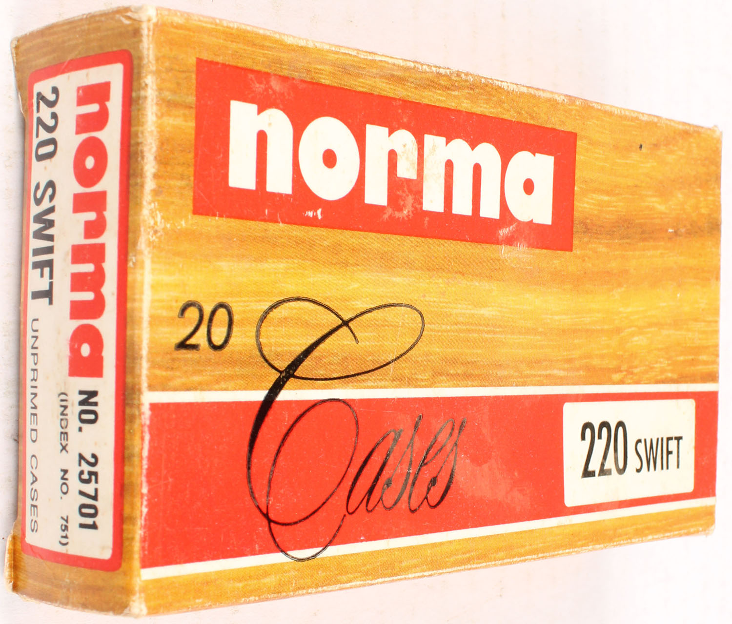 Norma, .220 SWIFT, boxed marked unprimed case but ammo is primed and loaded, 20 rds., 1pc. multi-colored box, box is solid, Ammo is excellent. Grade: Excellent - Value: 10 to 60