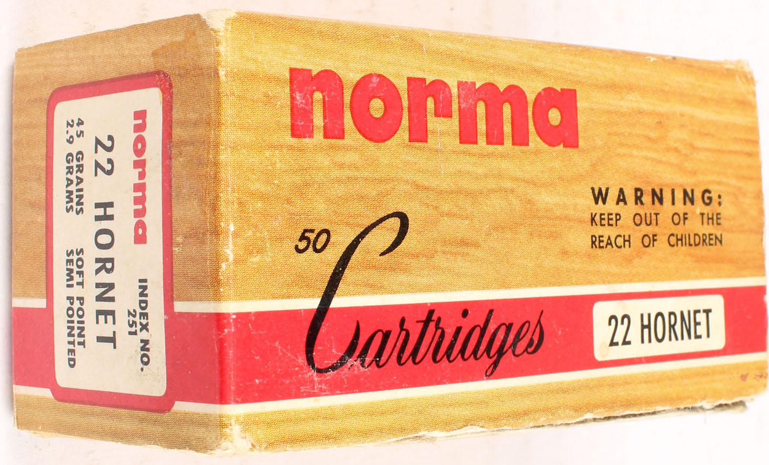 Norma, .22 HORNET, 45 Grains Soft Point, Full, 1pc. multi-colored box, box has 1 seam split to top, Ammo is excellent. Grade: Very Good - Value: 30 to 90