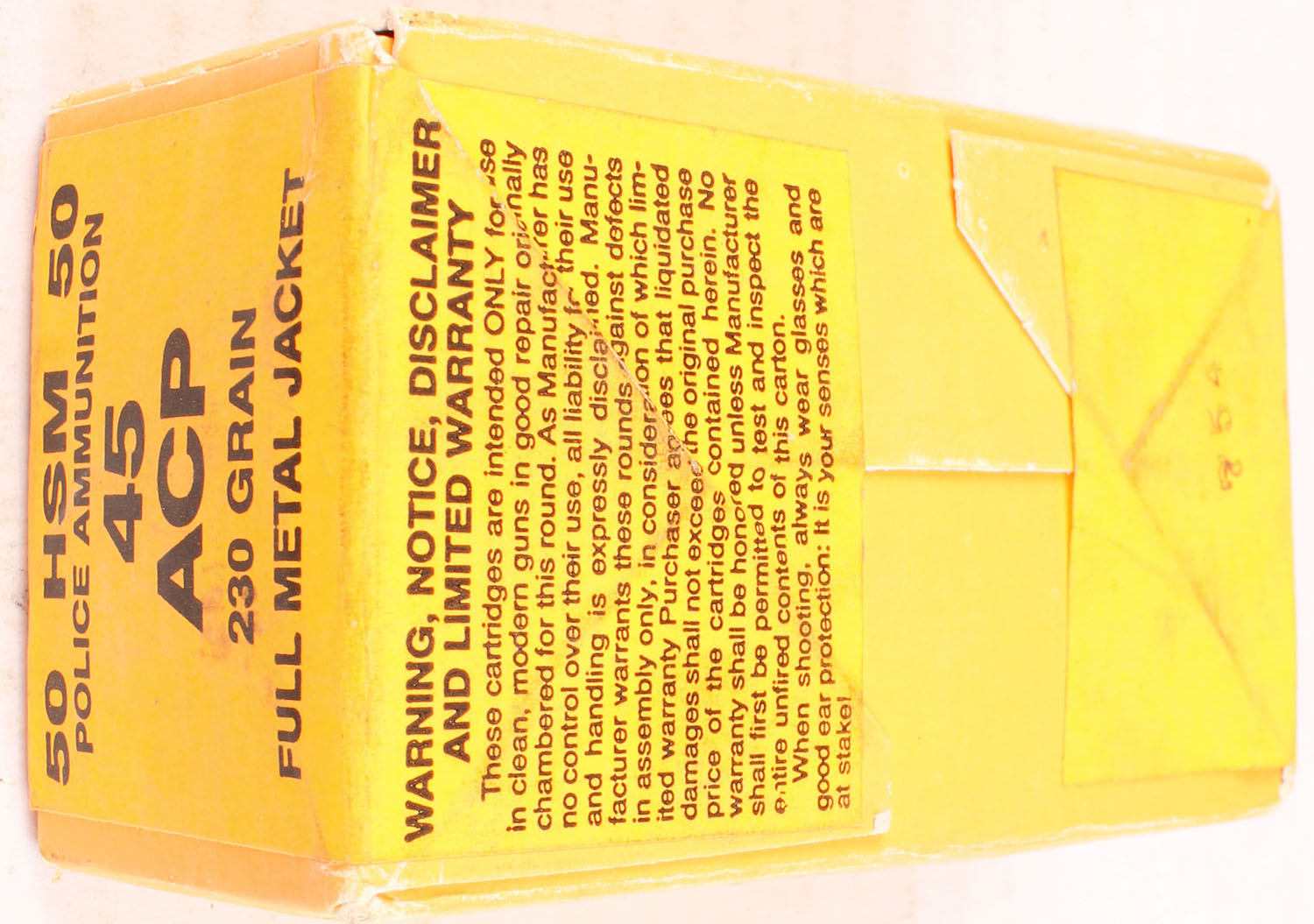 HSM, .45 ACP, 230 Grain FMJ, FULL & SEALED, POLICE AMMUNITION, 1pc., orange and black box, box is solid. Grade: Excellent - Value: 16 to 60