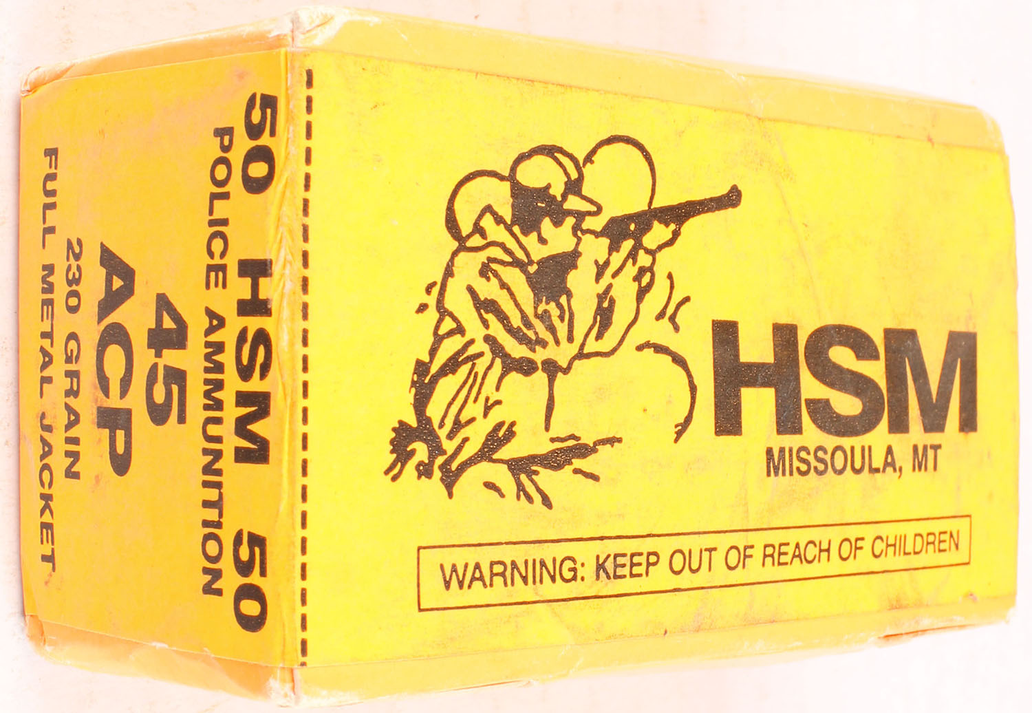 HSM, .45 ACP, 230 Grain FMJ, FULL & SEALED, POLICE AMMUNITION, 1pc., orange and black box, box has scuffing. Grade: Very Good ++ - Value: 16 to 60