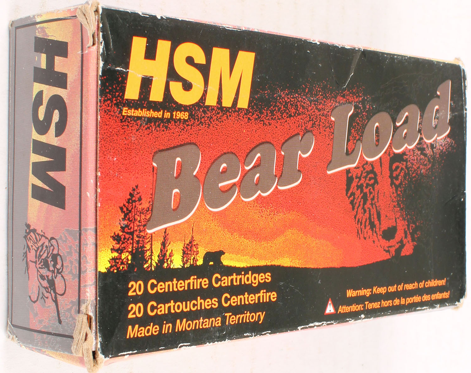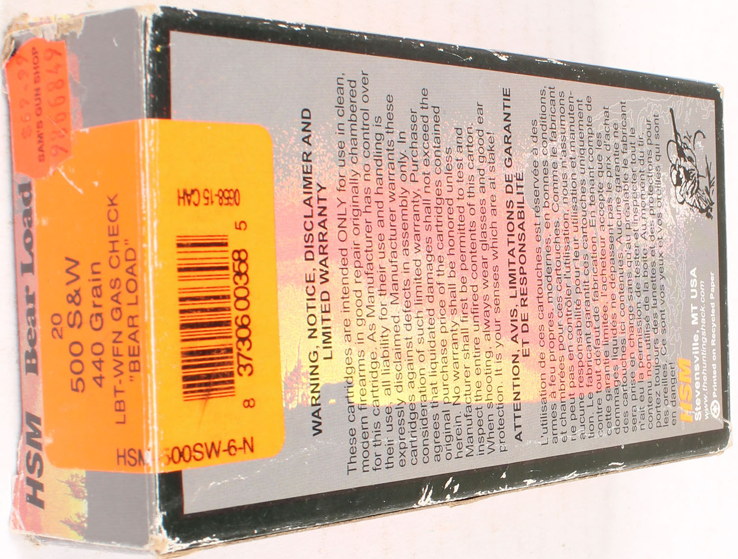 HSM, BEAR LOADS, 500 S&W, 440 Grain LBT-WFN Gas check ''Bear Load'', Full, 1pc., multi-colored box, box has scuffing to edges, Ammo is excellent. Grade: Very Good ++ - Value: 20 to 60