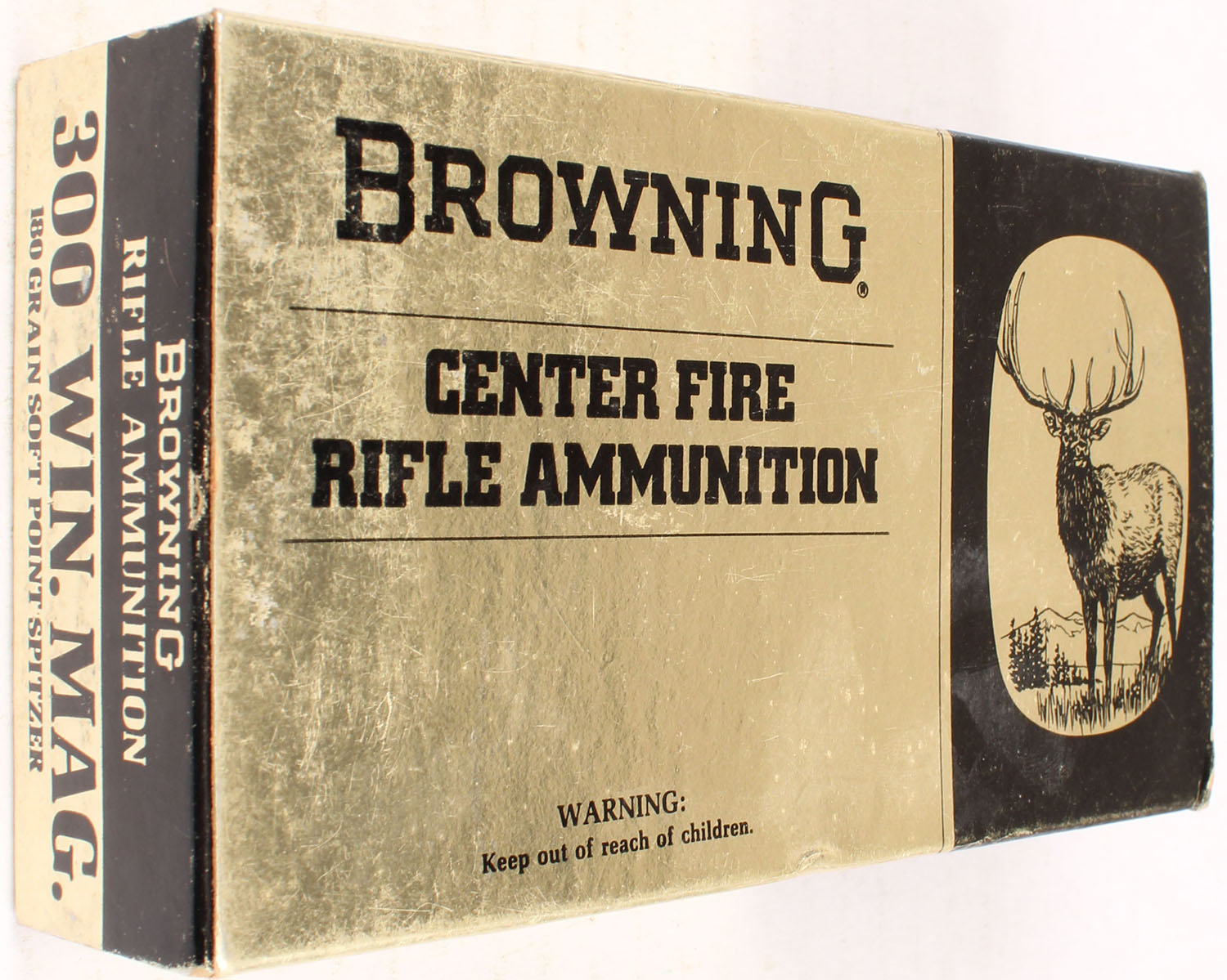 Browning, .300 Win Mag, 180 Grain Soft Point Spitzer, Full, 1pc., multi-colored box, box has scuffing, Ammo is excellent. Grade: Excellent - Value: 50 to 150