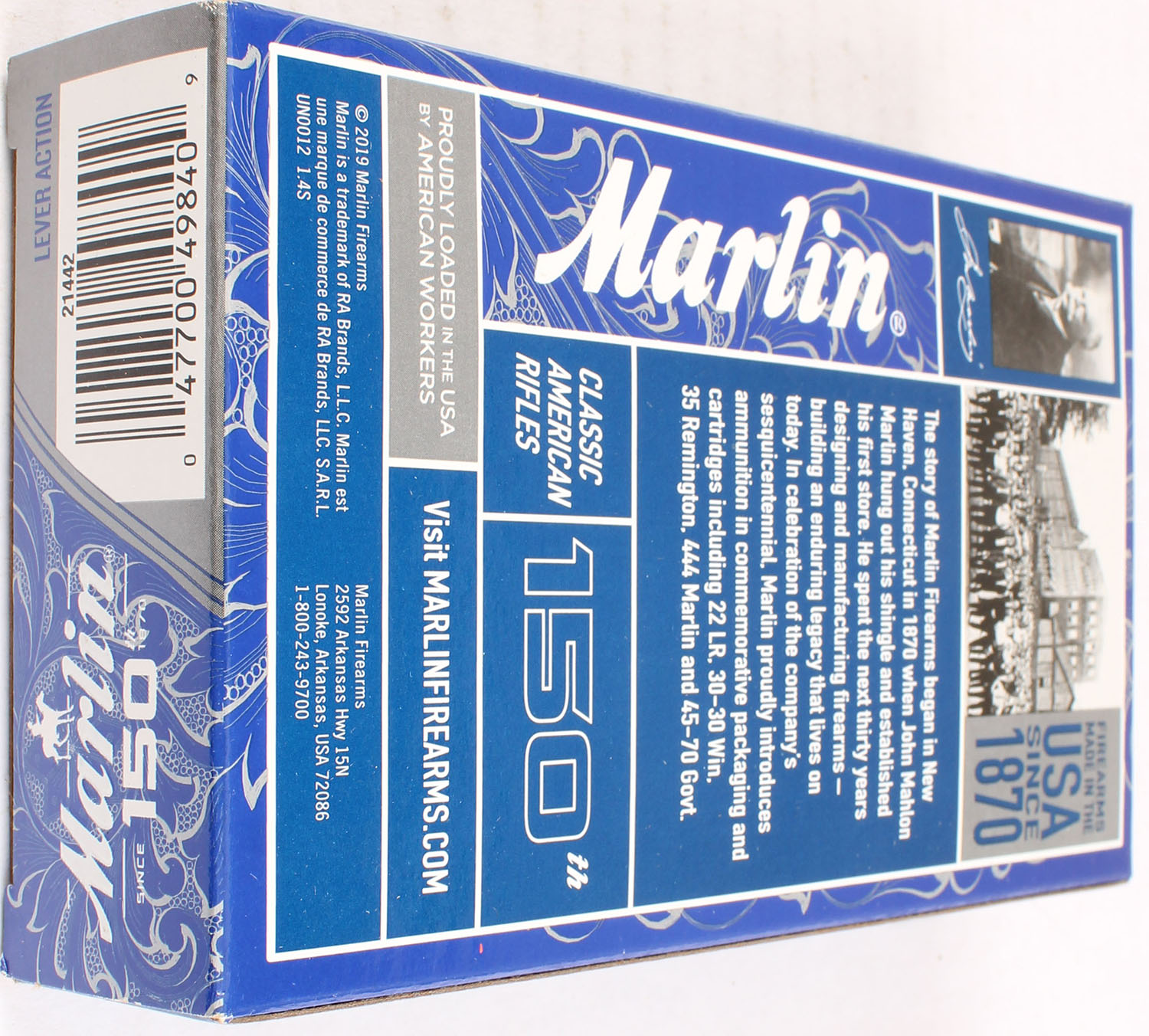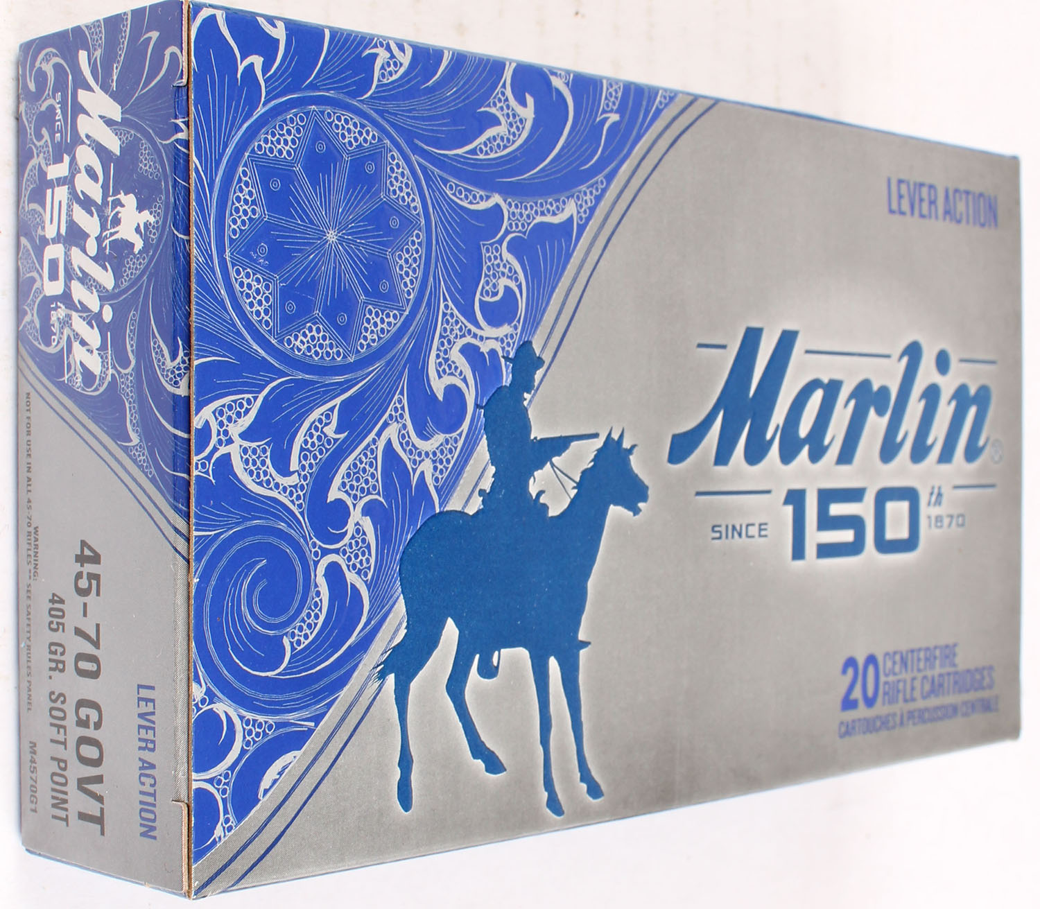 Marlin, .45-70 Gov't, 405 Grain SP, Full, 1pc., multi-colored box, box is very bright and clean, Ammo is excellent. Grade: Excellent ++ - Value: 40 to 100