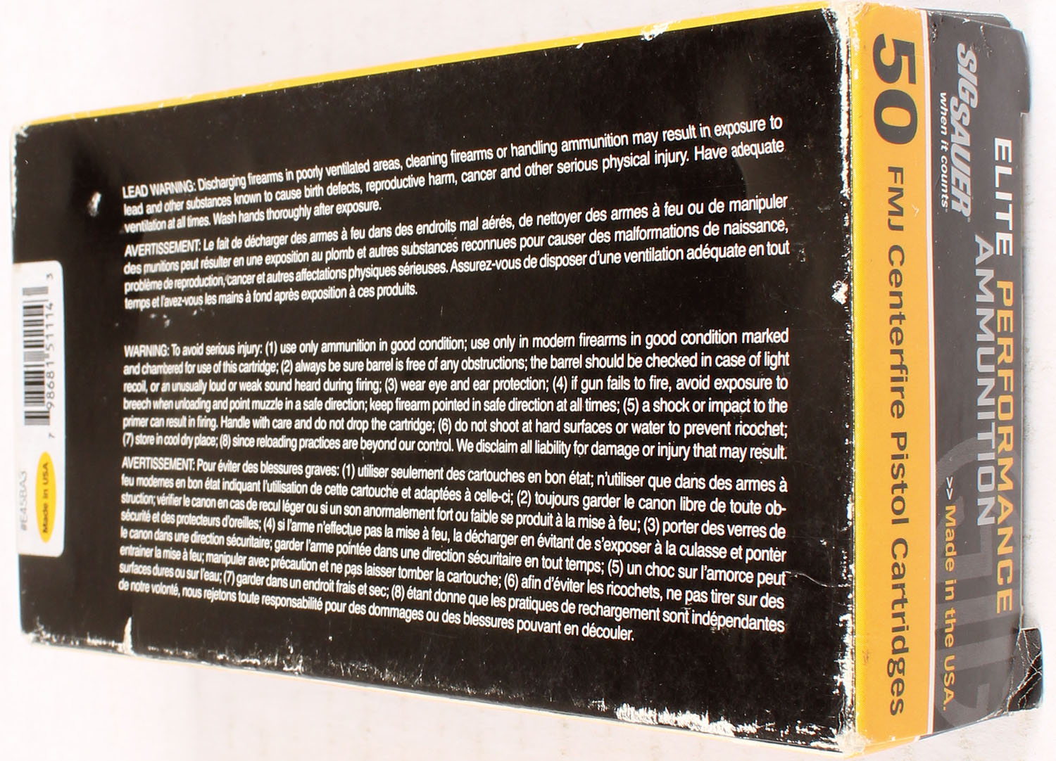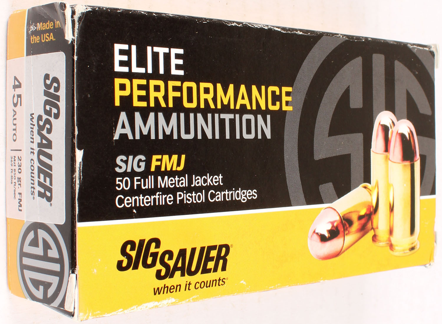 Sig Sauer, Elite Performance, 45 auto, 230 Grain FMJ, Full, 1pc. multi-colored box, box has edge wear, Ammo is excellent. Grade: Excellent - Value: 10 to 50