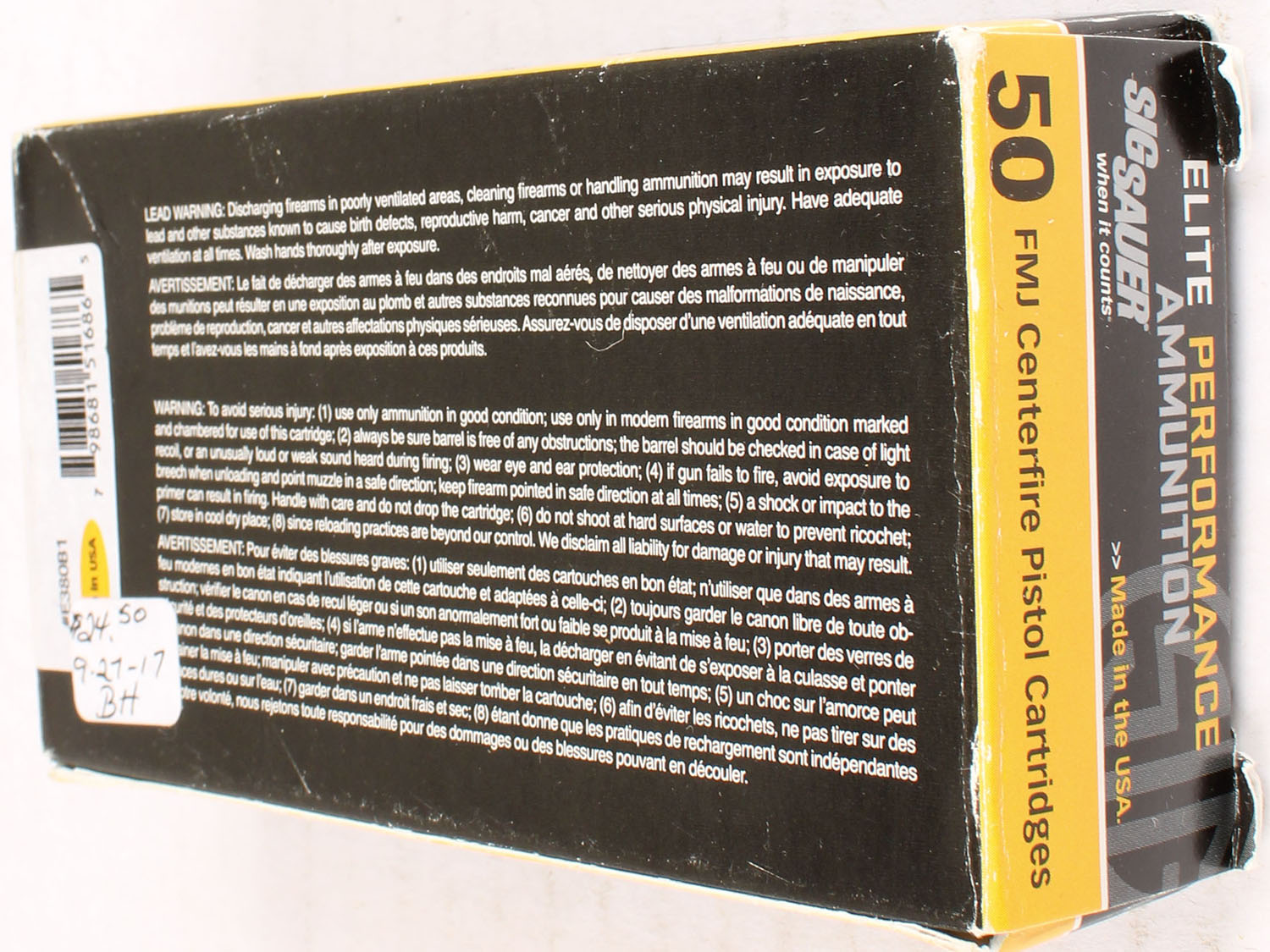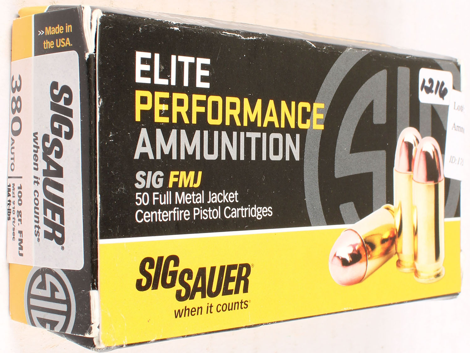 Sig Sauer, Elite Performance, .380 auto, 100 Grain FMJ, Full, 1pc. multi-colored box, box has edge wear, Ammo is excellent. Grade: Excellent - Value: 10 to 50