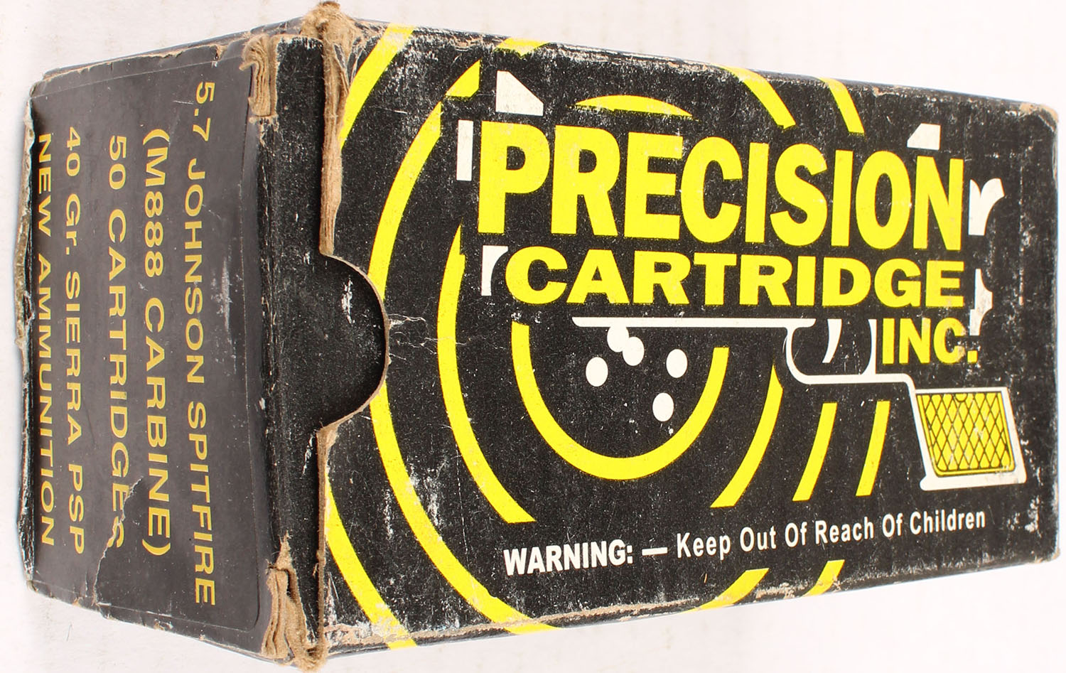 RARE! Precision cartridge Inc. 5.7 Johnson Spitfire, (M888 Carbine), 40 gr. Sierra PSP, FULL, box has scuffing, ammo has age soiling and is only very good. Grade: Very Good - Value: 200 to 400