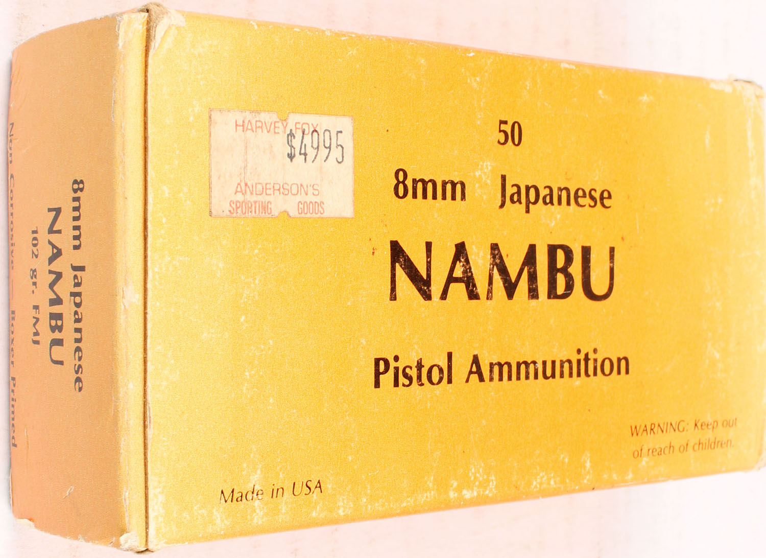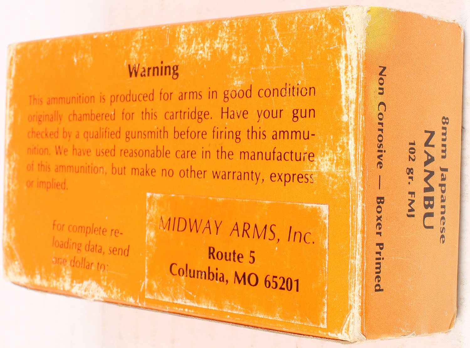 Midway Arms Inc., 8mm Japanese Nambu, Full, 1pc. Orange and black box, box has scuffing, Ammo is excellent. Grade: Very Good - Value: 20 to 100