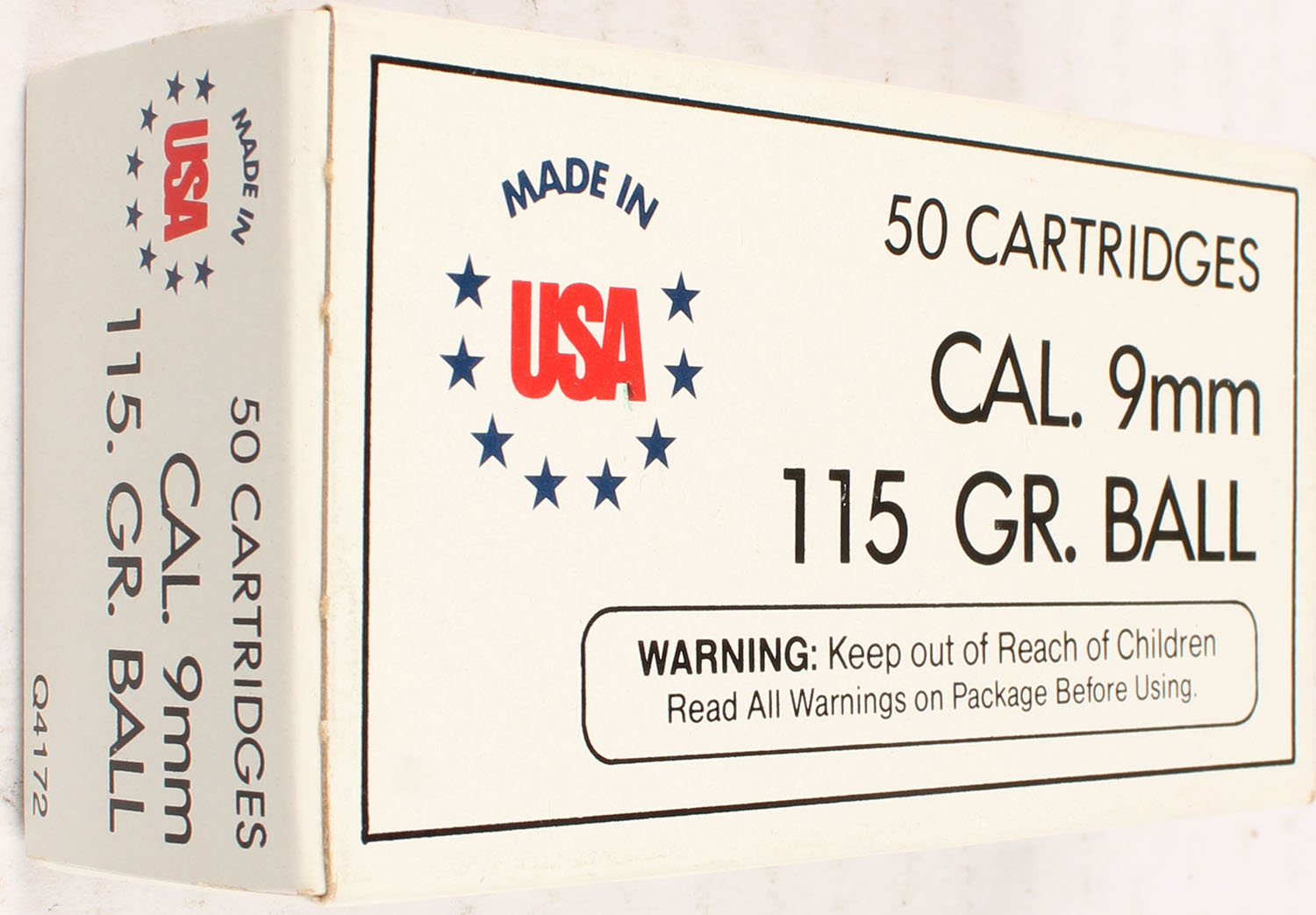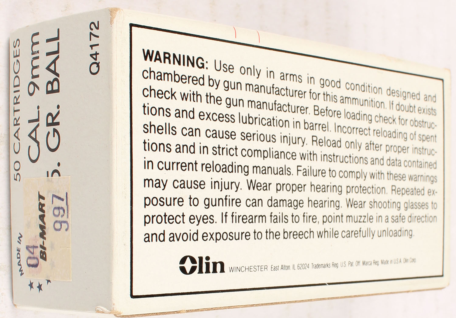 Winchester 9mm, 115gr., 1pc. multi-colored box, FULL, box is bright and clean, Ammo is excellent. Grade: Excellent ++ - Value: 10 to 50