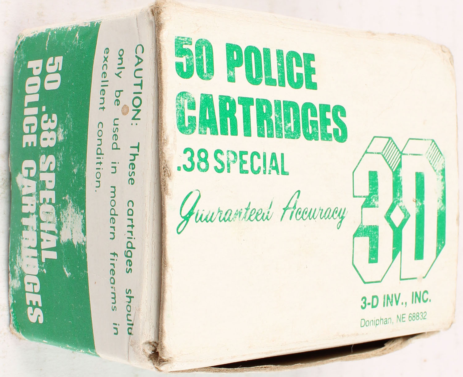 3-d .38 special, Police carts., 1pc., FULL, box has scuffing, Ammo is excellent. Grade: Excellent - Value: 10 to 50
