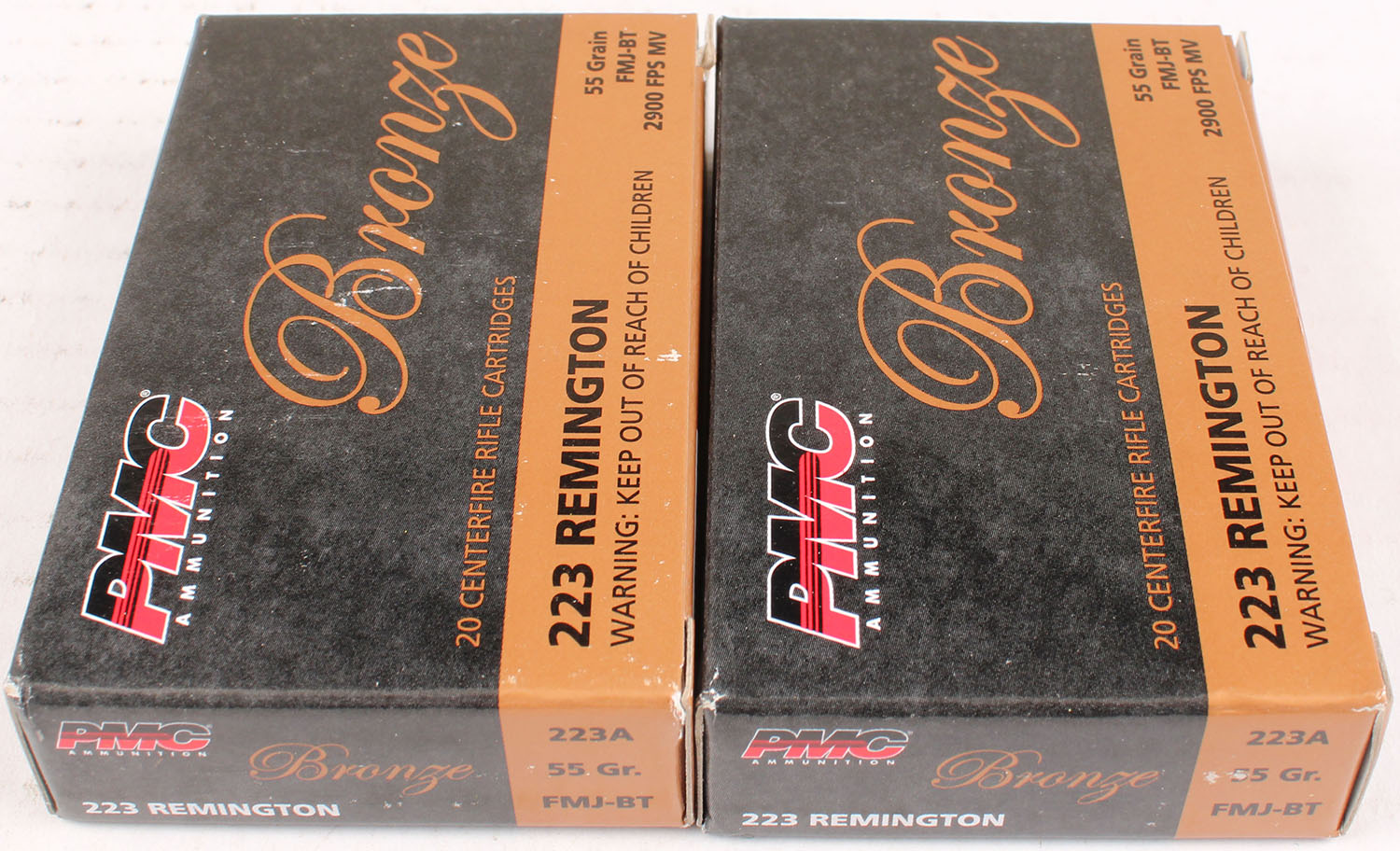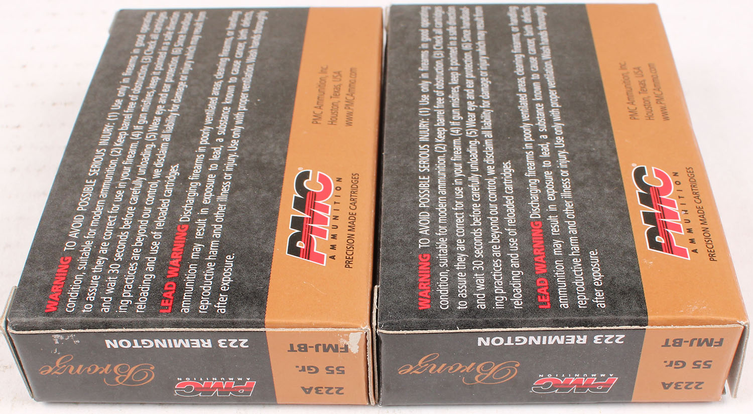 Lot of 2 PMC, Bronze, .223 Remington, 55 Grain FMJ-BT, Full, 1pc., multi-colored box, box is solid with excellent color, Ammo is excellent. Grade: Excellent - Value: 10 to 50