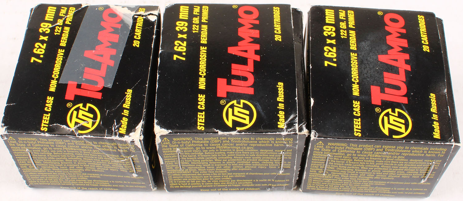Lot of 3 Tul-ammo, 7.62x39mm, 122 Grain, Full, 1pc., multi-colored box, box is solid with excellent color, Ammo is excellent. Grade: Excellent - Value: 10 to 50