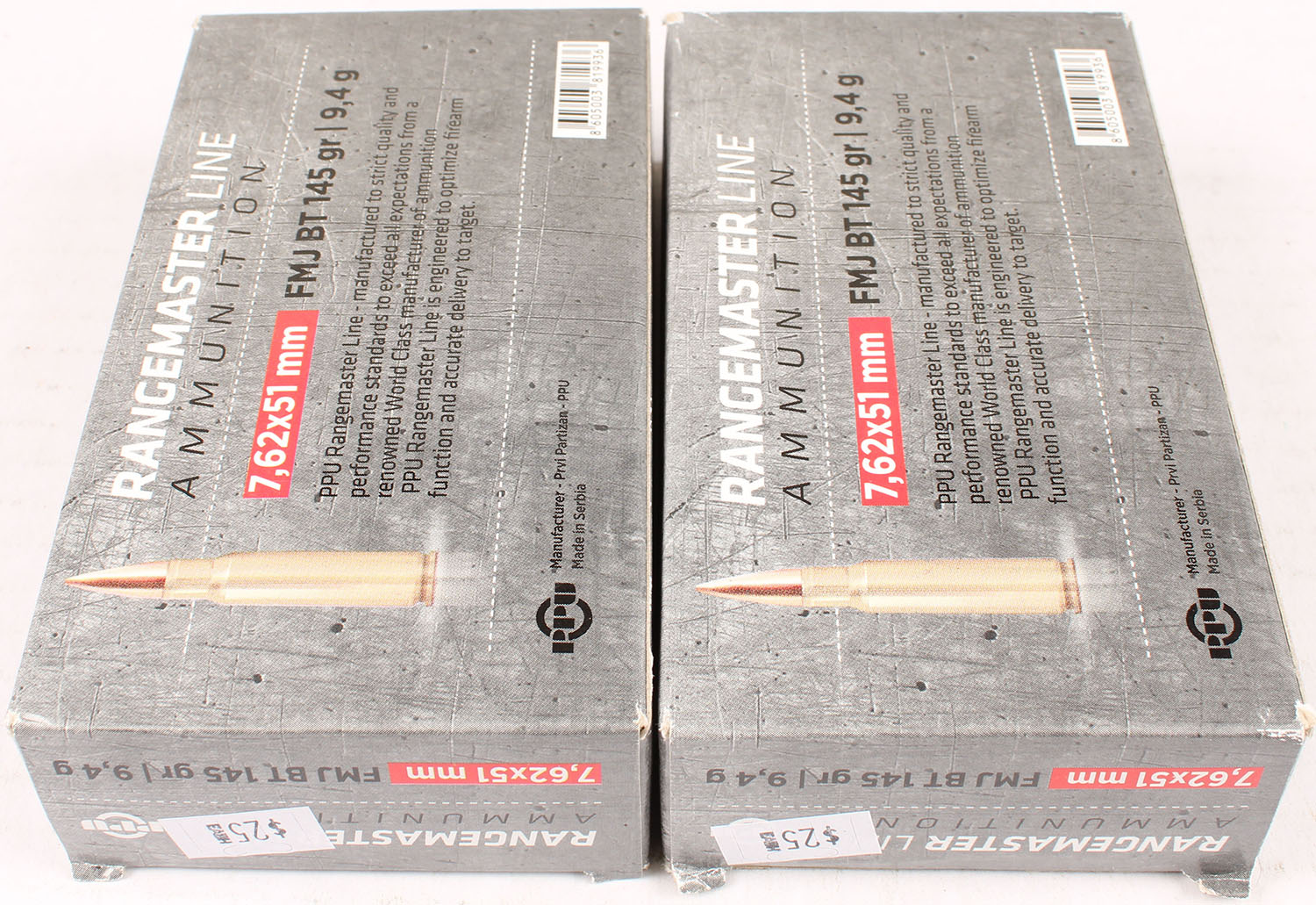 Lot of 2 PPU, 7.62 x 51mm, 145 Grs., Full, 1pc. Multi-colored box, box is solid, with excellent color, Ammo is excellent. Grade: Excellent - Value: 20 to 80